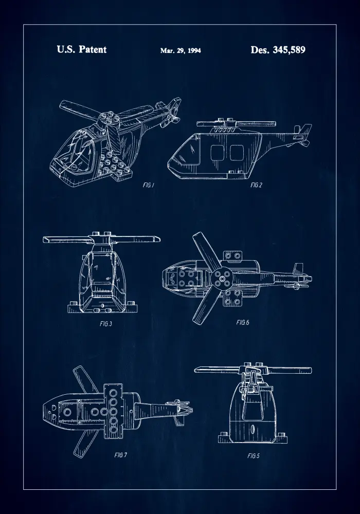 See eksklusiivne patentplakat kujutab Lego helikopteri esteetilist ja funktsionaalset meistriteost, mis põhineb U.S. Patent Des. 345,589, dateeritud 29. märts 1994. Sügav meresinine taust, mis vastandub kaunilt valgetele joontele, püüab see patentjoonis arenenud insenerikunsti ja disaini olemust. See on austusavaldus innovatsioonile ja ideaalne neile, kes hindavad tehnilist meisterlikkust ja ajalooliselt mõjuvat disaini oma sisustusvalikutes.