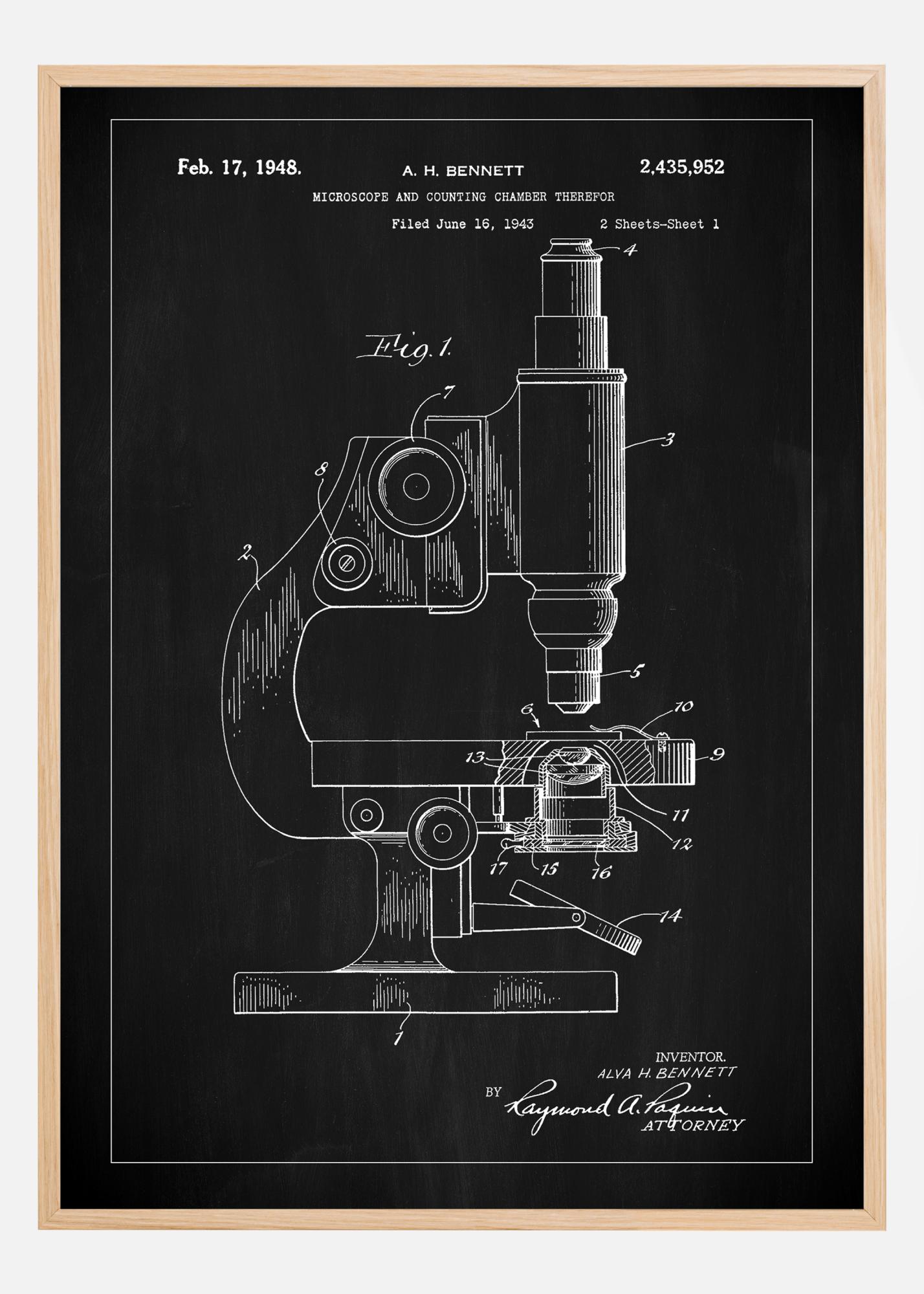Selle patendiplakati taustal on peen must tahvel, mis toob elegantselt esile 17. veebruaril 1948 loodud mikroskoobi klassikalise patendijoonise. Valged jooned tumedal taustal loovad dramaatilise efekti ja illustreerivad mikroskoobi konstruktsiooni ning selle lugemiskambri uuenduslikke omadusi. See on ikooniline kujutis teaduslikust täpsusest ja funktsionaalse kujunduse ilust.