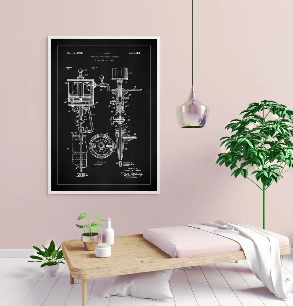 See patendiplakat ei ole ainult austusavaldus ajaloolisele inseneriteadusele, vaid toimib ka ainulaadse ja vestlust alustava seinalekoratsioonina. Iga kaasaskantava õlledosaatori nummerdatud osa on selgelt tähistatud, rõhutades leiutise keerukust ja leiutaja geeniust. Ideaalne kontorisse, baari või mehekoopasse, see plakat kombineerib tööstusliku võlu klassikalise puudutusega ja tõmbab kindlasti külastajate ja külaliste tähelepanu, kes hindavad tehnika ja disaini arengut.
