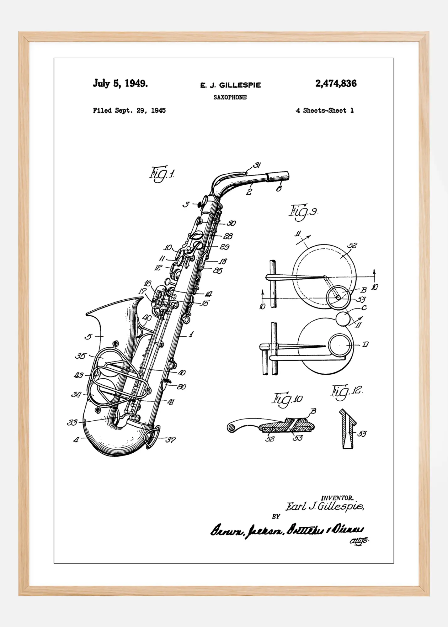 See hoolikalt üksikasjalik patendiposter esitleb saksofoni patendijoonistust, dateeritud 5. juuli 1949. See on silmapaistev näide muusikariista tehnilisest konstruktsioonist ja disainist, mida rõhutavad patendi selged jooned ja täpsed tähistusmärgid. Muusikasõpradele, pillimeistritele ja haruldaste diagrammide asjatundjatele on see patendiplakat stiilne austusavaldus loomingulisele protsessile, mis on saksofoni valmistamise taga.