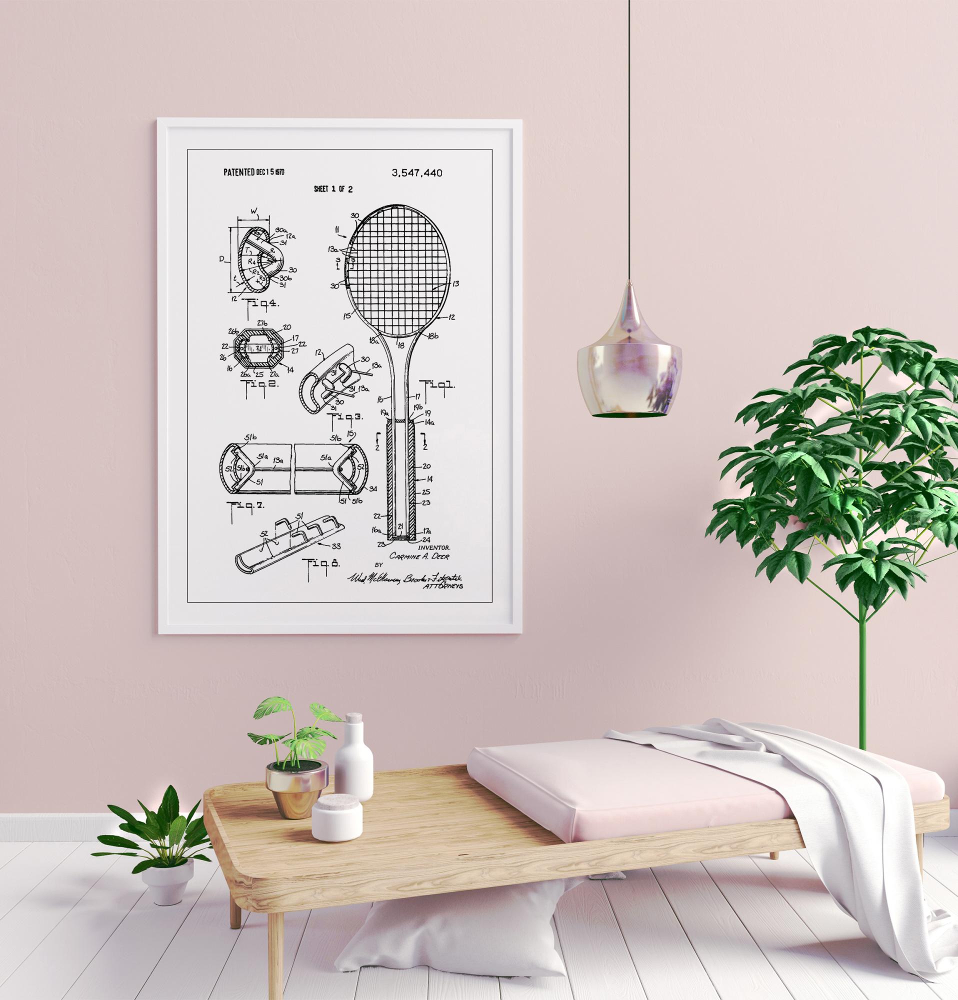 Selles patendiplakatil on kujutatud tehniline joonis ajaloolisest USA patendist 3,547,440, mis väljastati 15. detsembril 1970 ja mis esitleb tennise reketi leiutist. Oma täpsete joonte ja üksikasjalike visanditega reketi erinevatest osadest, alustades käepidemest ja lõpetades stringide mustriga, on see plakat tõeline insenerikunsti ja disainimeisterlikkuse esitus.