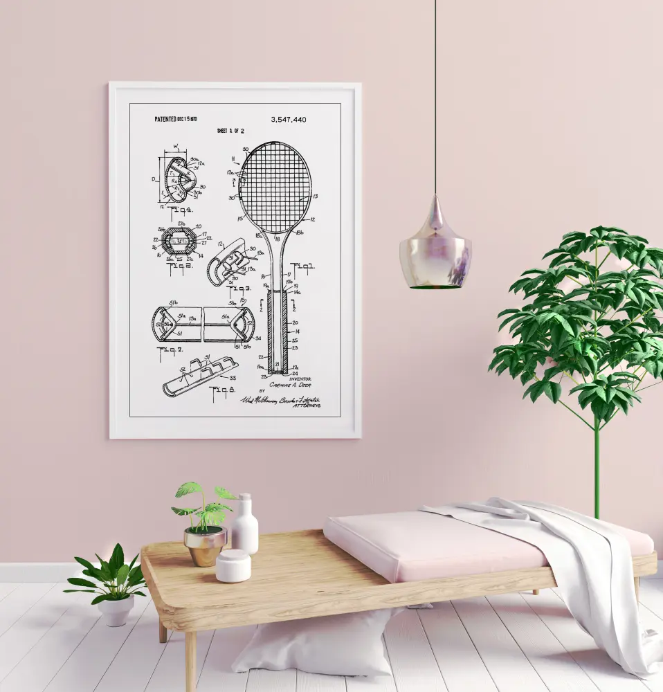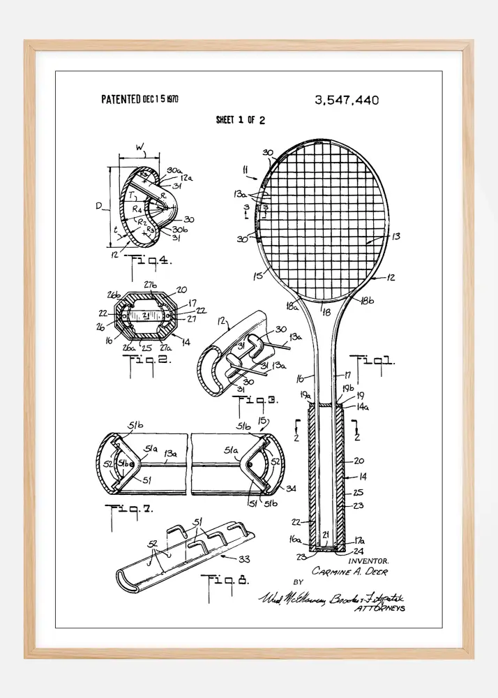 See patendiplakat kujutab endast tehnilist joonist ajaloolisest USA patendist 3,547,440, mis anti välja 15. detsembril 1970 ja mis tutvustab tennisereketi leiutist. Oma täpsete joonte ja detailsete visanditega, alates käepidemest kuni stringide mustrini, on see plakat tõeline insenerikunsti ja disainiviimistluse esitus.