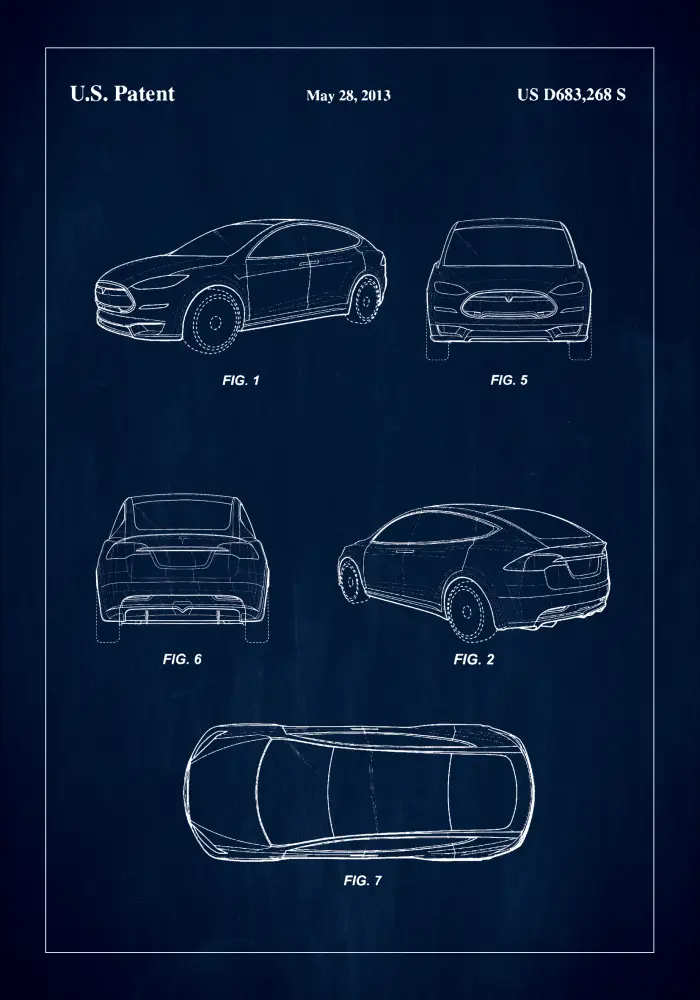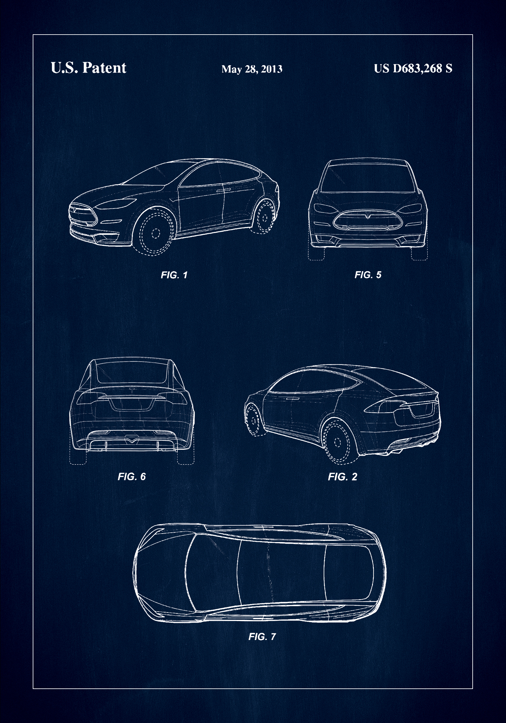 Meil on au esitleda seda patendiplakatit, graafilist esitust US D683,268 S, mis anti 28. mail 2013 ja kujutab Tesla sõiduki disaini, mis on sama uuenduslik kui esteetiliselt meeldiv. Plakat on ideaalne täiendus igale kollektsionääri kodule või töökohale, pakkudes ainulaadset sissevaadet sõidukitööstuse ühe silmapaistvama vormi disainiprotsessi.