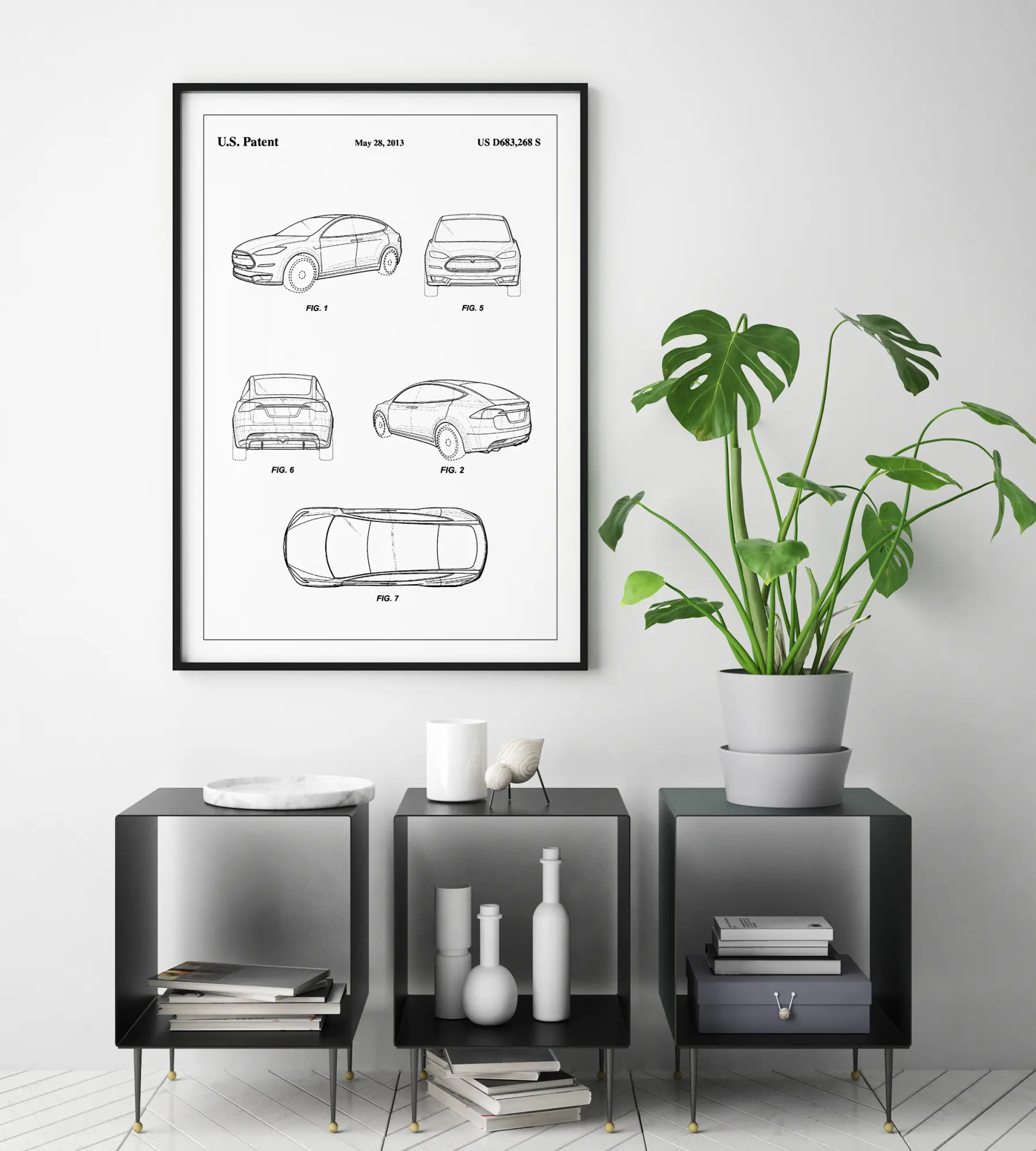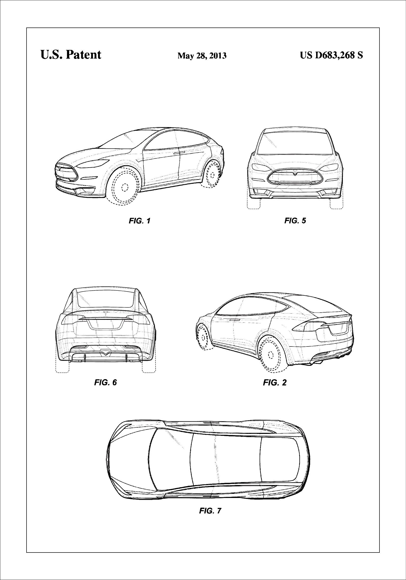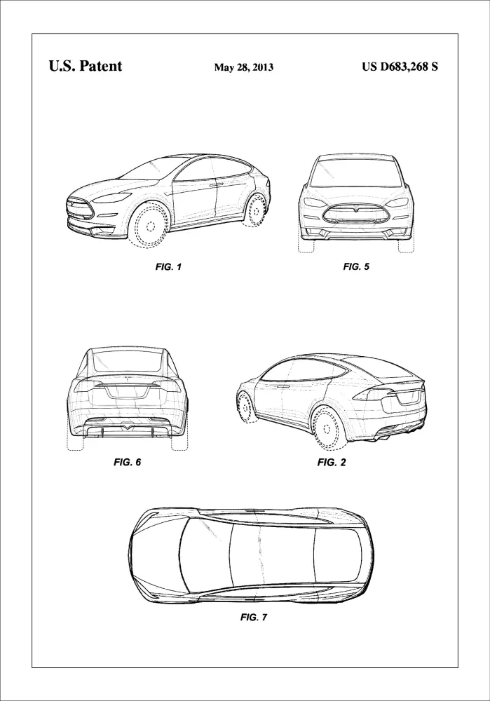 Avastage uuenduste ja stiili maailm selle erilise Tesla patendi plakatiga, mis uhkelt esitleb patendinumbrit US D683,268 S, välja antud 28. mail 2013. See minimalistlik ja elegantne patendiplakat toob esile revolutsioonilise sõidukidisaini, mis esindab tehnoloogia tipptaset ja tööstusdisaini. Plakat köidab pilku oma teravate joonte ja täpsete detailidega, muutes selle silmapaistvaks sisustuselemendiks igas kaasaegses kodus või kontoris.