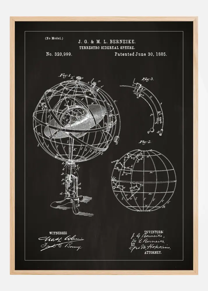Sellel ainulaadsel patendiplakatil on kujutatud leidlik ja detailne Terrestro Sidereal Sphere patendijoonis, mille patenteerisid 30. juunil 1885 J.G. & M.L. Berenike. Keeruline disain toob esile 19. sajandi innovatsioonide tehnilise oskuse ja annab tunde ajaloo tiibade kohinast. Illustratsioon koosneb keerukatest geomeetrilistest kujunditest, mis töötavad koos, et luua mudel taevakehade liikumisest Maa suhtes, peegeldades tolle aja põnevat astronoomilist teadmust.