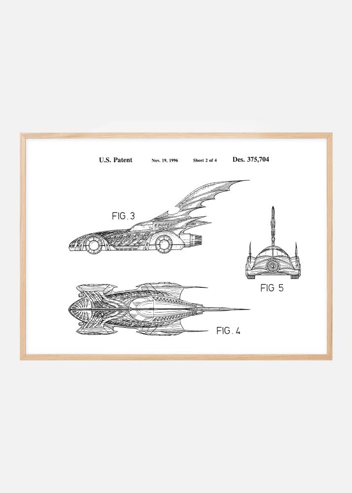 See ainulaadne patendiposter näitab suurejoonelisi jooniseid Ameerika Ühendriikide patendist Des. 375,704, dateeritud 19. november 1996. See kunstiline patentjoonis loob loomingulise atmosfääri igas ruumis, kujutades kontseptauto, mis on sama palju kunstiteos kui tehniline ime. Joonis. 3 ja Joonis. 4 esitavad Batmobile'i profiilis ja ülevaates, andes vaatajale aimu selle uuenduslikust kujust ja struktuurist, samas kui Joonis. 5 keskendub iseloomulikule tagaküljele ja selle ainulaadsetele omadustele.