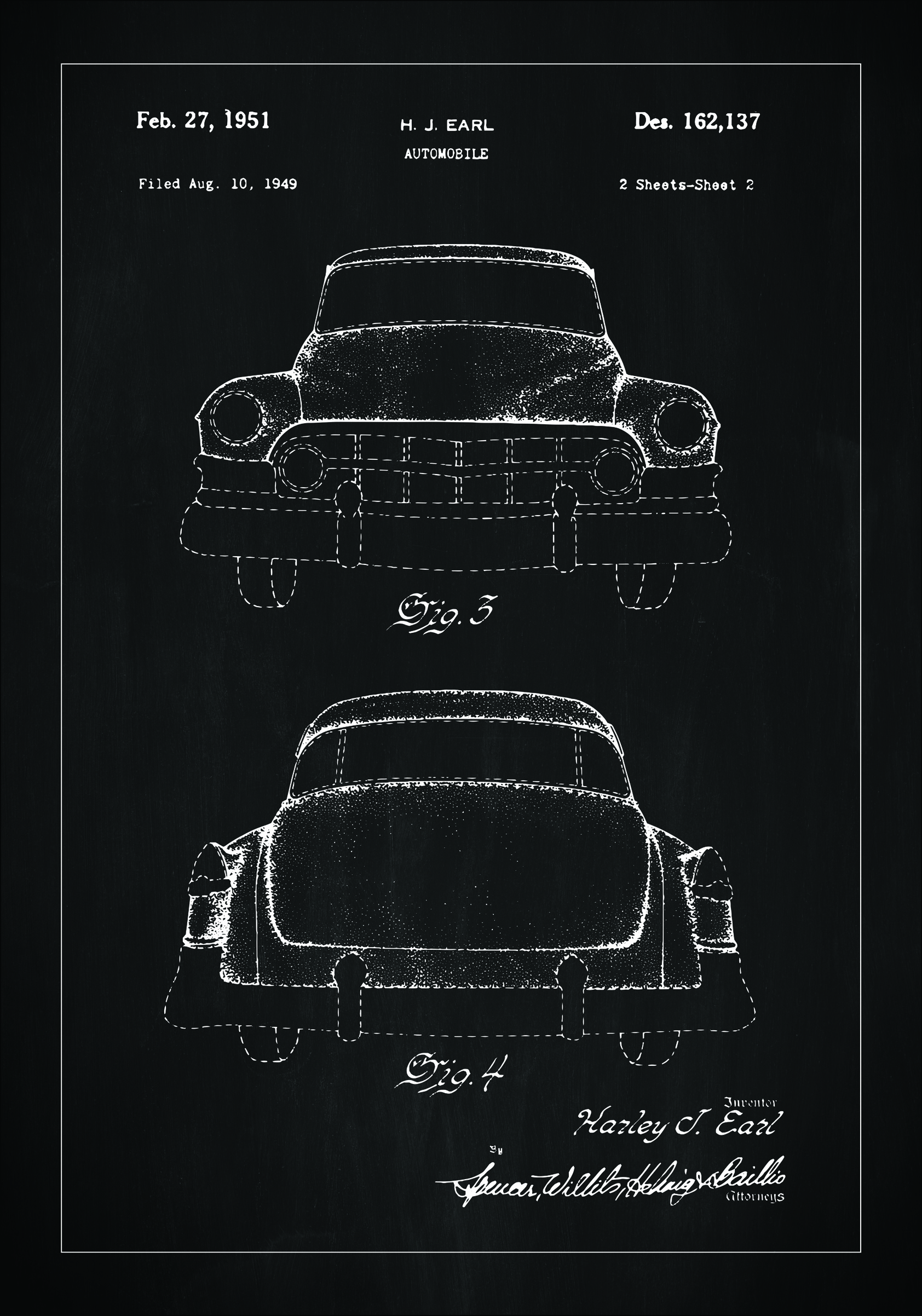 See patendiplakat kujutab klassikalist Cadillac'i automudelit, mis patenteeriti 27. veebruaril 1951 patendinumbriga Des. 162,137. Leiutaja H.J. Earl esitas patenditaotluse 10. augustil 1949. Illustratsioonid näitavad sõiduki esi- ja tagavaadet, pakkudes selget pilti ajatu disaini ja esteetiliste joonte kohta, mis olid sellele ajastule iseloomulikud autokonstruktsioonis.