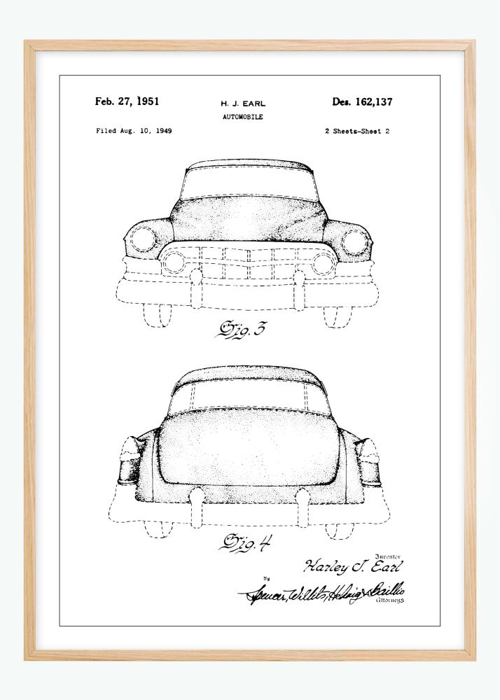 See stiilne patendiplakat kujutab ikoonilist Cadillaci, austusavaldus 20. sajandi autotööstuse edusammudele. Kujundanud H.J. Earl ja patenteeritud 27. veebruaril 1951 numbri Des. 162,137 all, on see patentjoonis kohustuslik kõigile, kes hindavad klassikalise auto esteetikat ja disainiajalugu. Plakat näitab sõidukit profiilist ette- ja tagantpoolt, ning illustratsioonide detailirohkus tekitab nostalgiat ja imetlust.