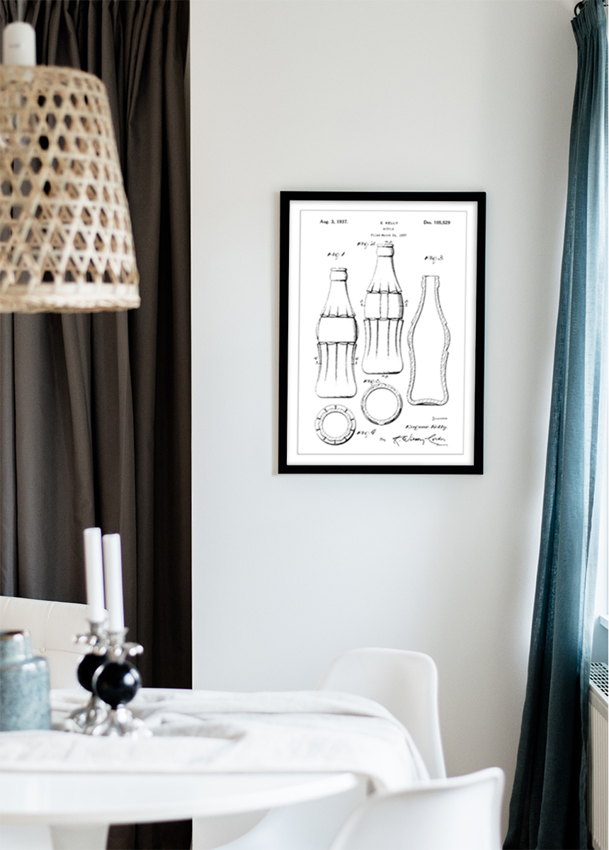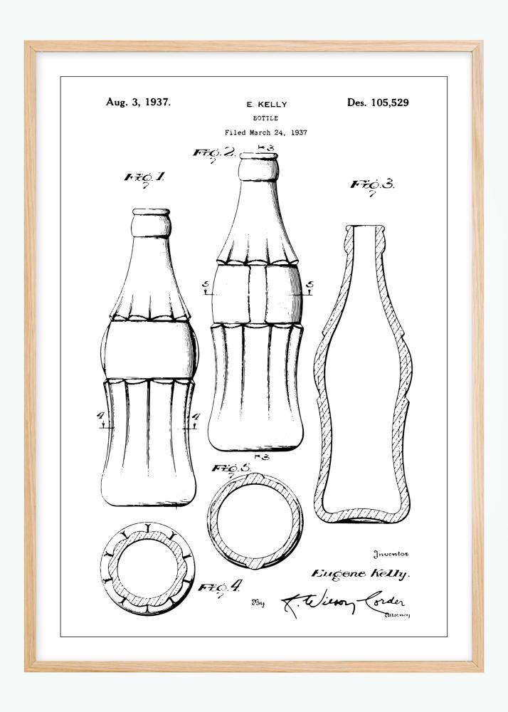 See patendiplakat näitab Coca-Cola pudeli disaini, mis anti E. Kelly'le 3. augustil 1937 patendinumbriga Des. 105,529. Illustratsioon näitab pudeli detailseid kontuure ja proportsioone mitme nurga alt, andes täieliku pildi disainist. Pudeli ikooniline kuju on muutunud sünonüümiks selle sisuga ning on ajatu esitus brändingust ja tootedisainist.