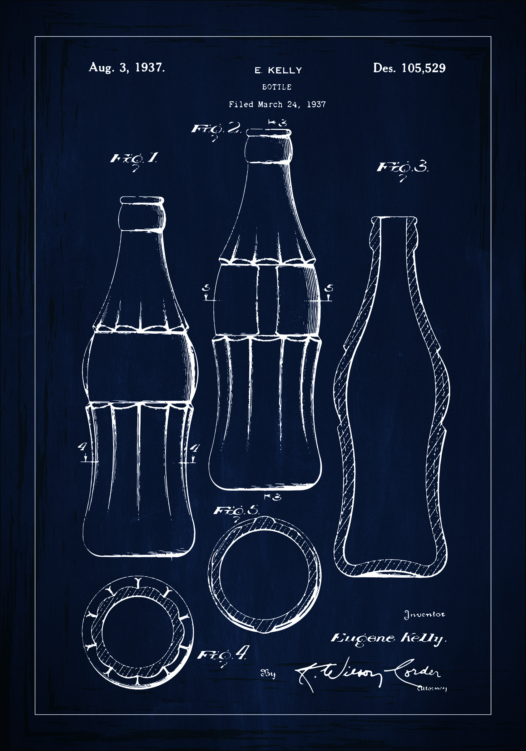 See patendiposter illustreerib Coca-Cola pudeli disainipatenti, mis anti välja 3. augustil 1937 patentinumbriga Des. 105,529. Leiutaja Eugene Kelly oli selle klassikalise disainipatendi taga, mis esitati 24. märtsil 1937. Joonised näitavad pudeli kuju erinevatest vaatenurkadest, sealhulgas esiküljest, virnastatud grupina, külgvaates ja kahes ristlõikes. Detailid ja proportsioonid toovad esile selle eripärase ja äratuntava kontuuri, mis on saanud ikooniliseks üle kogu maailma.