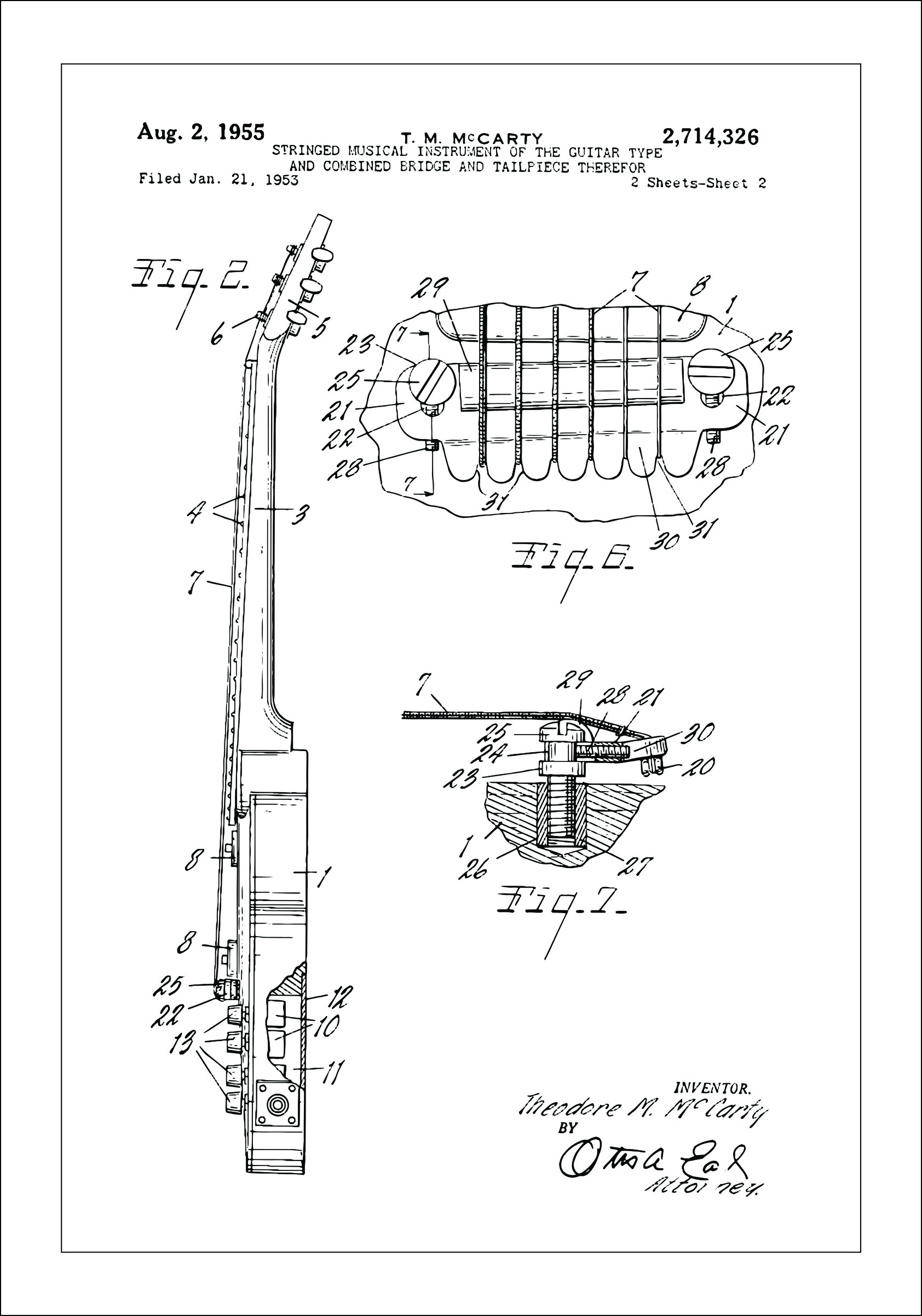 See patendiplakat näitab leiutist keelpilli jaoks, täpsemalt elektrikitarrile, mille patent anti 2. augustil 1955 patendinumbriga 2,714,326. Leiutaja Theodore M. McCarty esitas taotluse 21. jaanuaril 1953. Illustratsioonid annavad üksikasjalikud vaated pilli kaelast, kehast ja peast ning läbilõike, mis näitab, kuidas keeled on ühendatud nii silla kui ka kitarri sabaga.