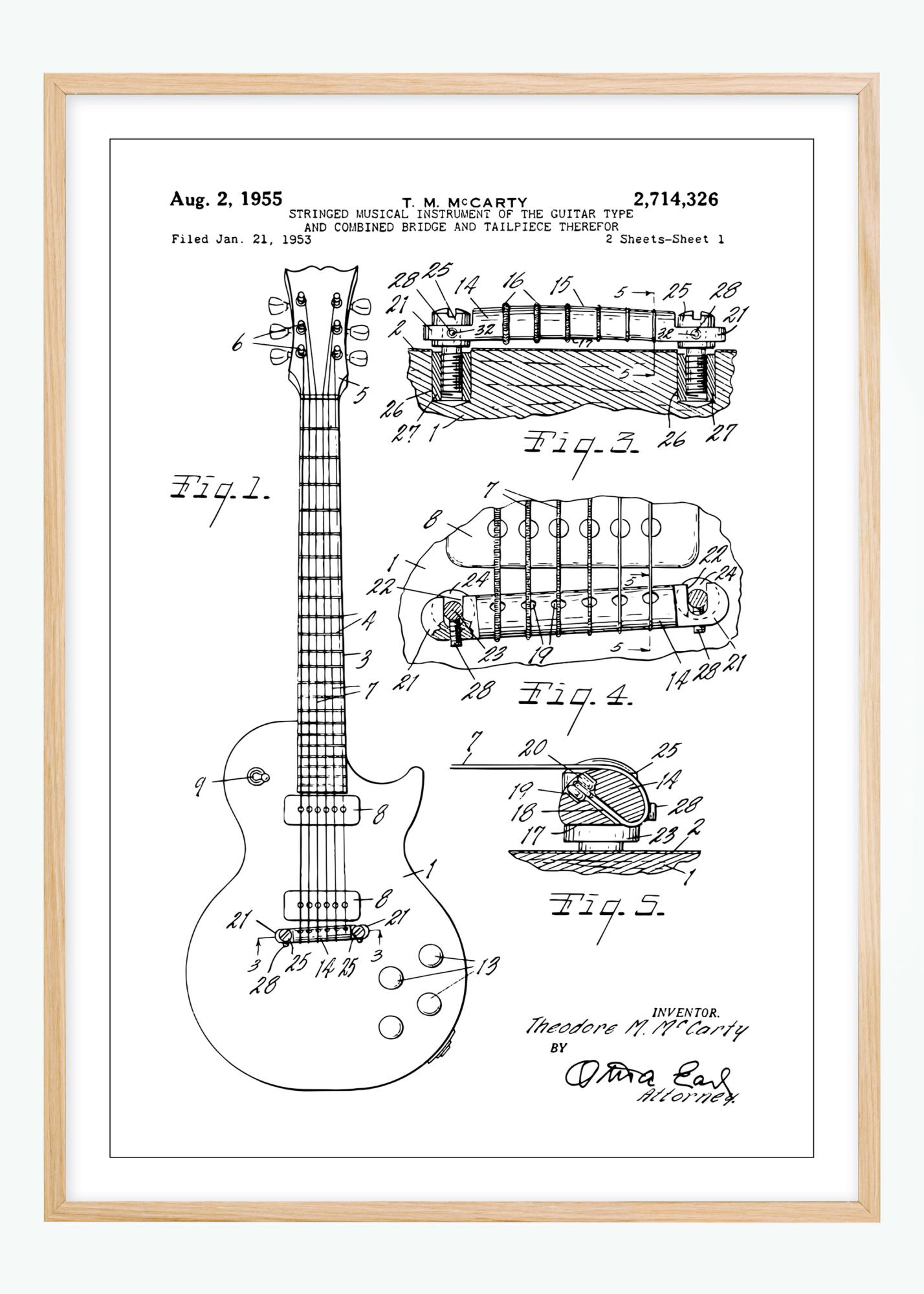 See patendiplakat näitab üksikasjalikku joonist keelpillist, täpsemalt kitarrist, mille dokumenteeris leiutaja Theodore M. McCarty 2. augustil 1955 patendinumbriga 2,714,326. Joonistus kujutab instrumendi konstruktsiooni koos kombineeritud silla ja sabaga, uuenduslik disain, mis aitas kaasa kitarri toonile ja mängitavusele. Erinevad vaated annavad ülevaate kitarri disaini mehaanilistest ja esteetilistest aspektidest.