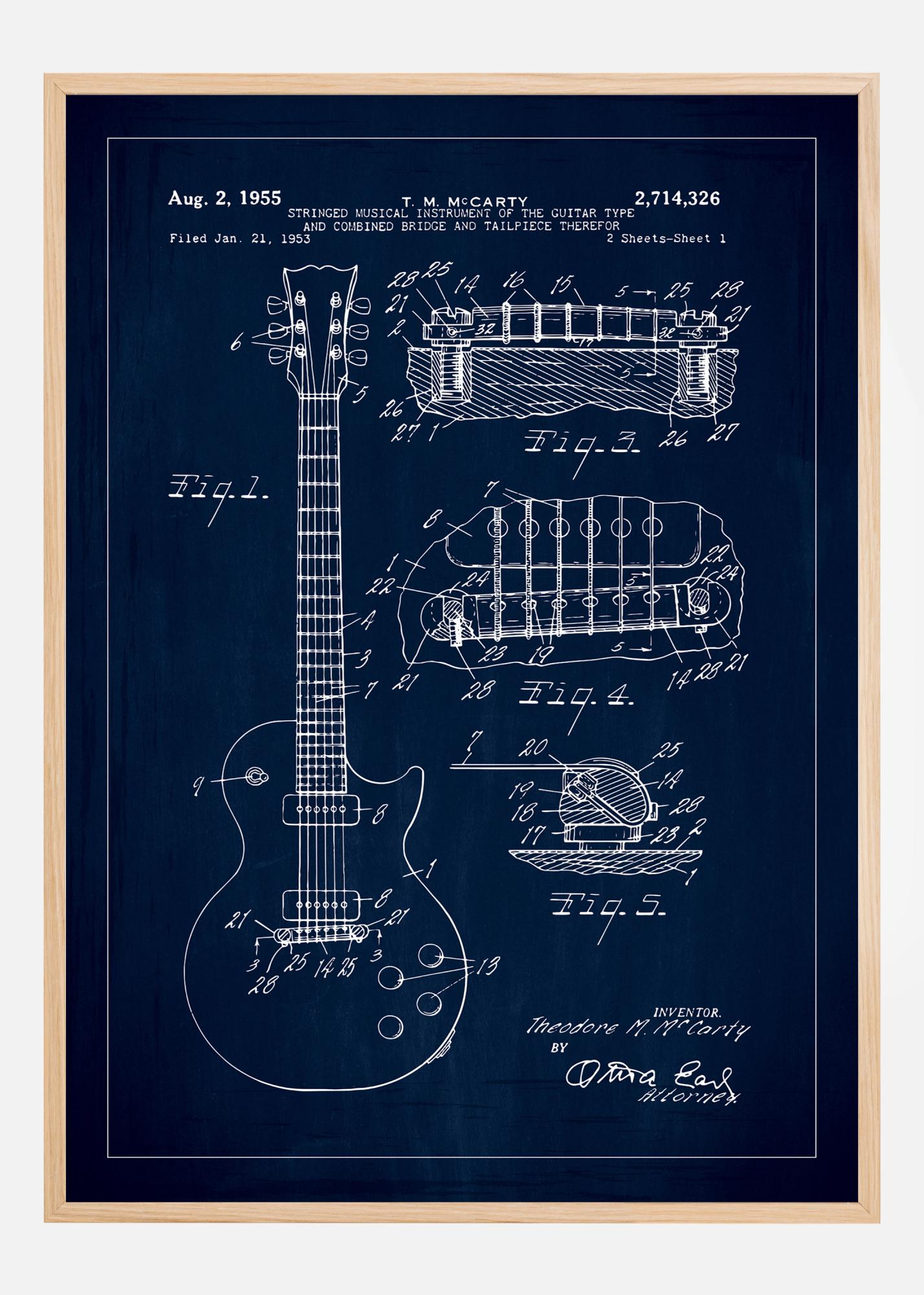 See patendiplakat näitab üksikasjalikku ja täpset joonist keelpillist 2. augustist 1955, patendinumbriga 2,714,326. Selle instrumendi patent, mida paljud tunneksid ära kui elektrikitarr, registreeriti Theodore M. McCarty poolt 21. jaanuaril 1953. Plakat kujutab instrumenti elegantsel üldpildil ja tehniliselt arenenud detailvaadetes, mis tõstab esile innovaatilise disaini ja kombineeritud sild- ja sadulakonstruktsiooni, mis kuulub selle ainulaadsete omaduste hulka.
