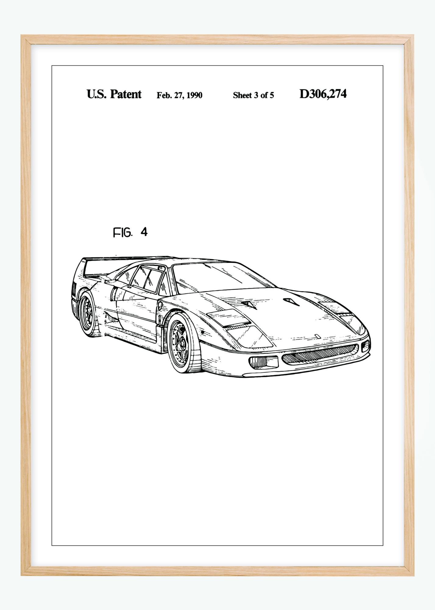 See patendiplakat kujutab Ferrar F40 teedrajavat disaini, mis on üksikasjalikult välja töötatud 27. veebruaril 1990, patendinumbriga D306,274. Illustratsioon näitab külge ikooniliseks saanud sportautost, mis on tuntud oma aerodünaamika ja eristuva stiili poolest. See on kujutis innovatsioonist ja edusammudest autotööstuses, mis köidab vaataja silma oma teravate joonte ja dünaamilise kujuga.