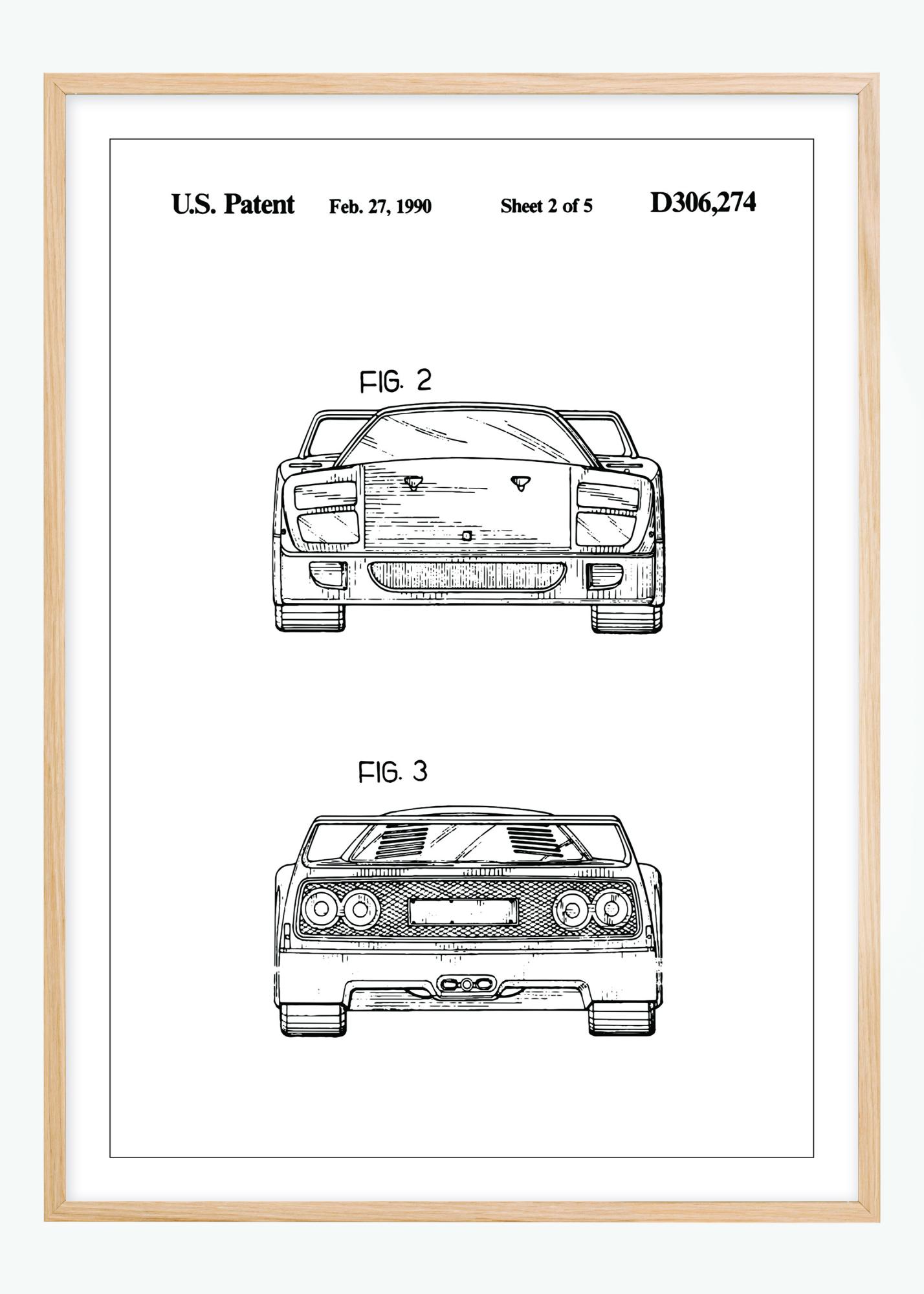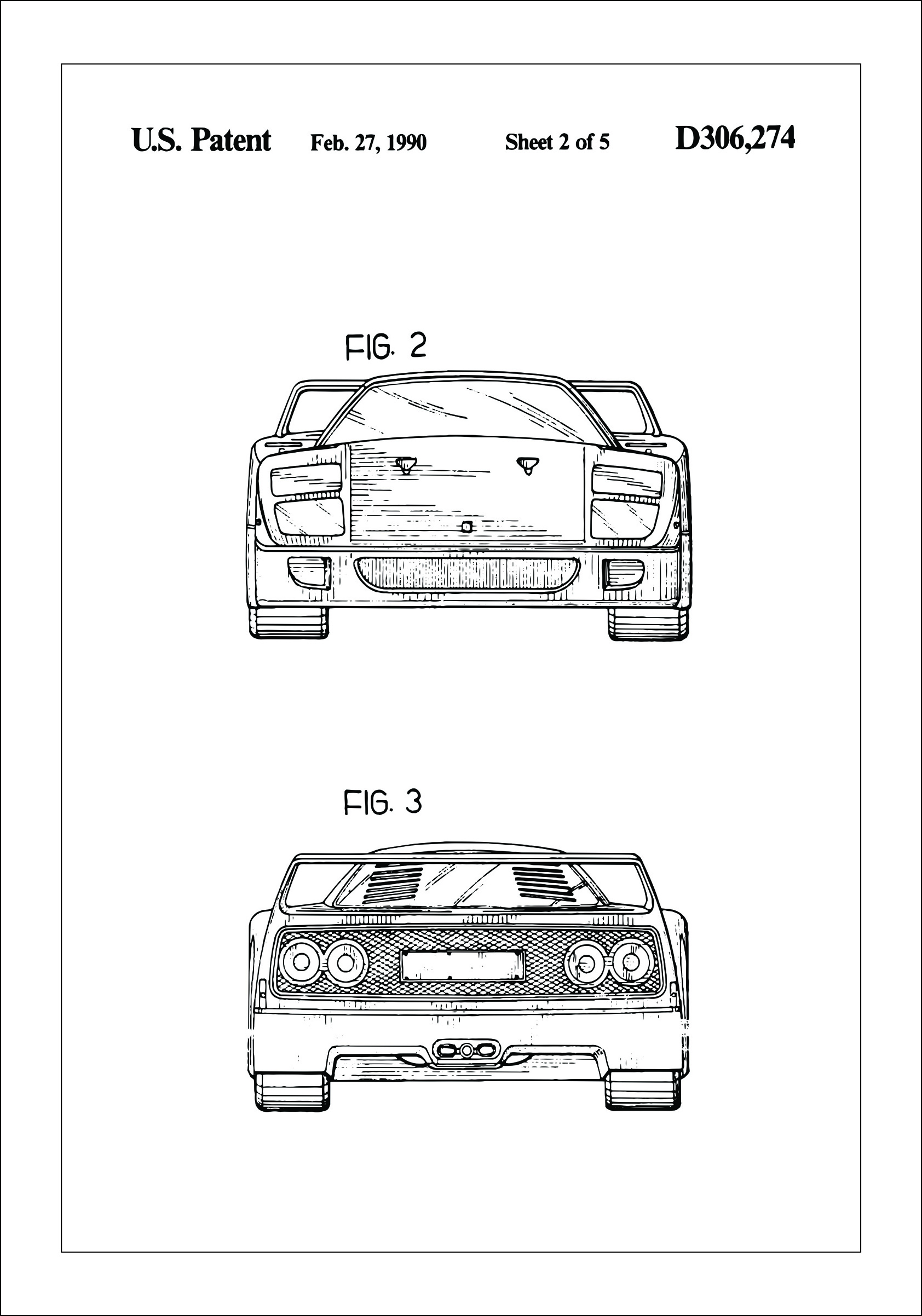 See patenteeritud plakat kujutab Ferrari F40 tagumist disaini, millele anti patent 27. veebruaril 1990 number D306,274 all. Joonised näitavad auto esi- ja tagakülge koos eripärase valguskorralduse, kaitseraua ja kujundusega. Illustratsioonide üksikasjad toovad esile unikaalsed disainielemendid, mis eristavad seda automudelit ja aitavad kaasa selle äratuntavusele teedel.