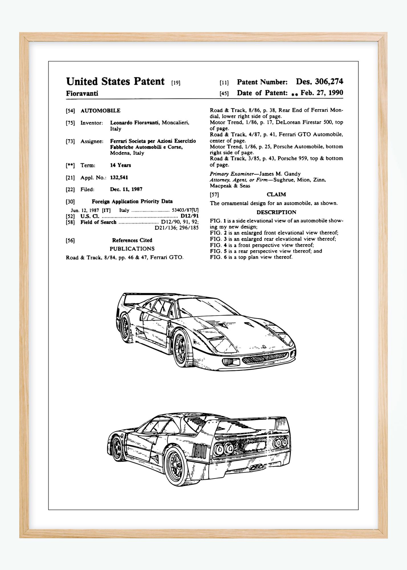 See elegantne patendiplakat näitab autot, mille Leonardo Fioravanti disainis Ferrarile, üks autotööstuse ikoonilisemaid nimesid. Kinnitatud 27. veebruaril 1990 patendinumbri Des. 306,274 all, esindab dokument Ferrari F40 esteetilist disaini, mis haarab kiiruse ja innovatsiooni olemust. Patendi illustratsioonid rõhutavad silmatorkavaid jooni ja aerodünaamilist siluetti, mis on aidanud brändi määratleda.