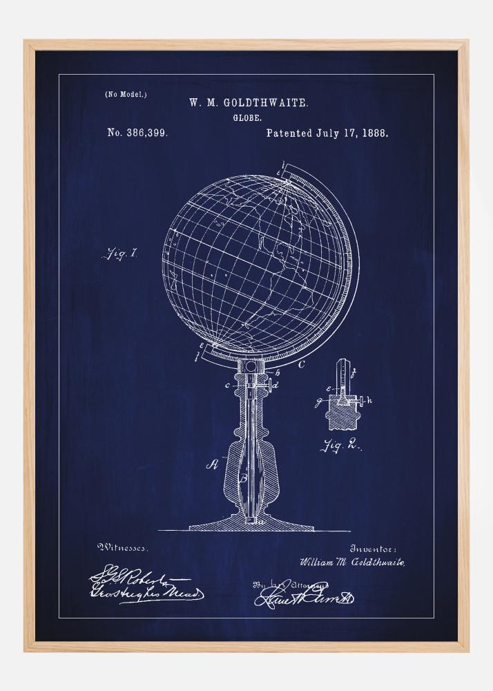 Loo kutsuv ja intellektuaalselt stimuleeriv ruum meie patentpostriga, mis kujutab W. M. Goldthwaite’i klassikaliselt kujundatud gloobust, mis on kaitstud patendinumbriga 386,399 alates 17. juulist 1888. See detailne patentjoonis püüab kinni mitte ainult disaini tehnilise täpsuse, vaid ka aja, mil globaalne avastamine ja mõistmine muutus kättesaadavaks laiemale publikule. Selline kunstiline maailma esitus pakub harivat perspektiivi ning on elegantne kaunistus.