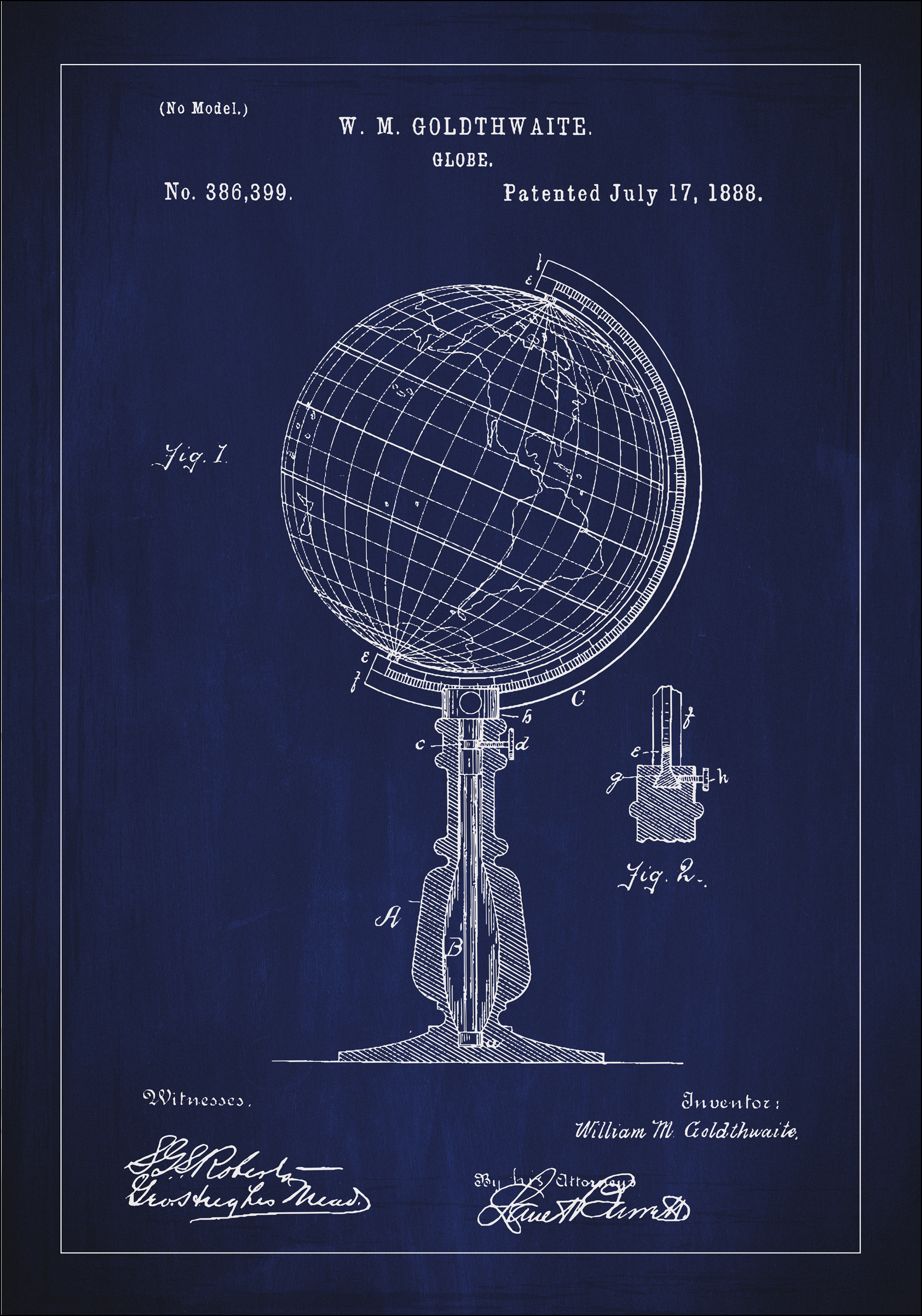 Loo kutsuv ja intellektuaalselt stimuleeriv ruum meie patendiplakatiga, mis kujutab W. M. Goldthwaite'i klassikaliselt kujundatud gloobust, kaitstud patendinumbriga 386,399 alates 17. juulist 1888. See detailiderohke patendijoonis ei püüa kinni mitte ainult disaini tehnilist täpsust, vaid ka aega, mil globaalsed avastused ja arusaamad said kättesaadavaks laiema publiku jaoks. Selline maailma kunstiline esitlus pakub hariduslikku perspektiivi, olles samal ajal elegantne kaunistus.