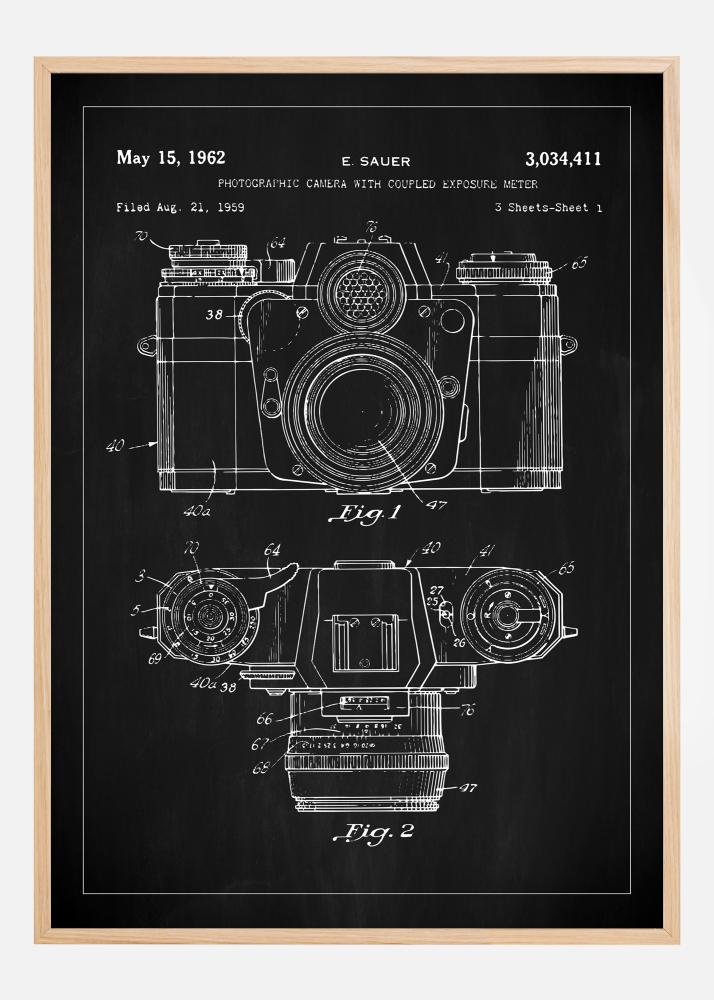 See patendiposter kujutab fotokaamerat koos ühendatud valgusmõõtjaga, mis sai patendi 15. mail 1962 numbriga 3,034,411. Leiutaja E. Sauer esitas patenditaotluse 21. augustil 1959. Üksikasjalik joonis näitab kaamera esikülge ja ülakorpust eestvaates ning alumisest perspektiivist, mis näitab kaamera alust ja objektiivi. Nende illustratsioonide tehniline täpsus ja läbimõeldud disain peegeldavad fotograafilise innovatsiooni ja loovuse ajastut.