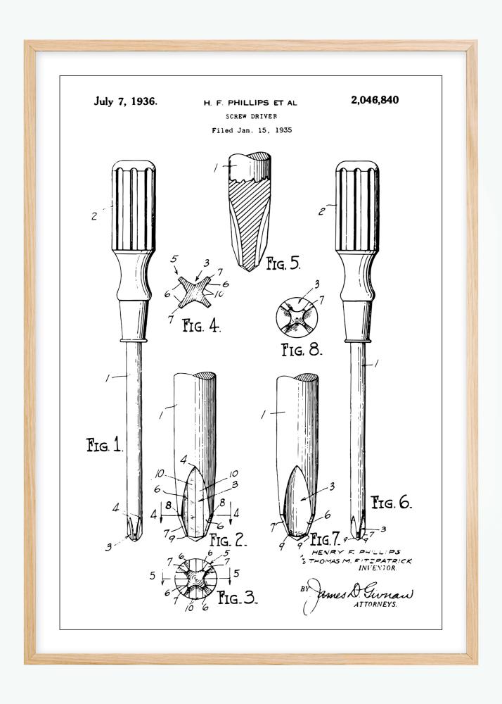 Esitletud on klassikaline patendiplakat, mis kujutab kruvikeeraja disaini, mis on asendamatu tööriistaklassika iga käsitöölise tööriistakastis. Dateeritud 7. juuli 1936 ja arhiveeritud 15. jaanuaril 1935, näitab see patendiplakat täpsete detailidega tööriista konstruktsiooni ja innovatsiooni, alates selle ikoonilisest käepidemest kuni otsa ainulaadse kuju. Leiutajad H.F. Phillips ja teised on selle patendiga, number 2,046,840, loonud tööriistatööstuses standardi, millele toetume tänapäevalgi.