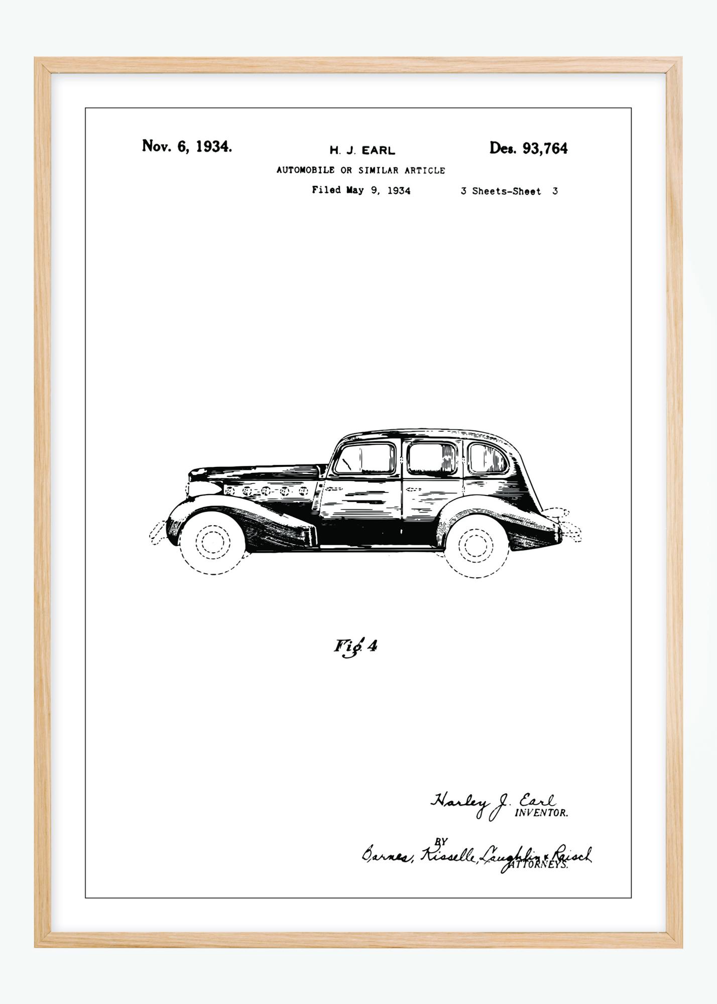 See patentplakat kujutab autot, mille patenteeris H.J. Earl 6. novembril 1934 patendinumbriga Des. 93,764. Leiutis puudutab autot või sarnast eset, nagu on märgitud 9. mail 1934 esitatud avalduses. Joonistus kujutab sõiduki külgvaadet, mis annab selge ülevaate selle disainist ja proportsioonidest, mis on sellele ajajärgule iseloomulikud.