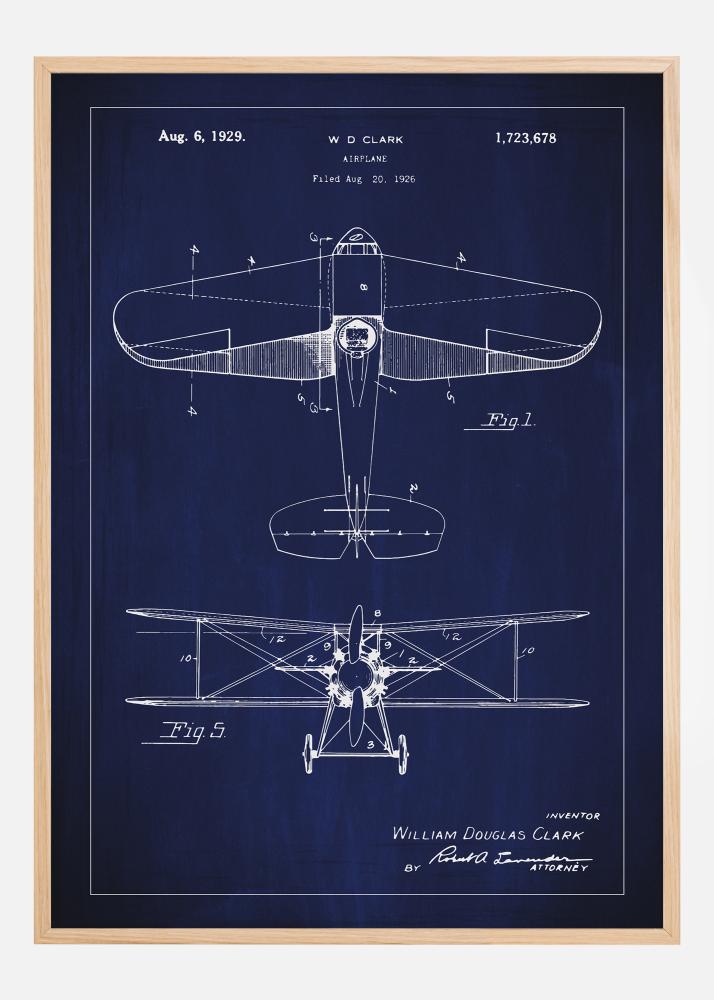 Loo lennundusajalooline atmosfäär selle patendipostriga, mis kujutab W D Clarki innovatiivset lennukidisaini. See lennuk, millele anti patent 6. augustil 1929 numbri 1,723,678 all, on ikooniline revolutsioonilise ajastu sümbol lennundustehnoloogias. Tume taust loob kauni kontrasti detailsete valgete joontaga, luues uhke ja läbimõeldud dekoratiivse detaili.