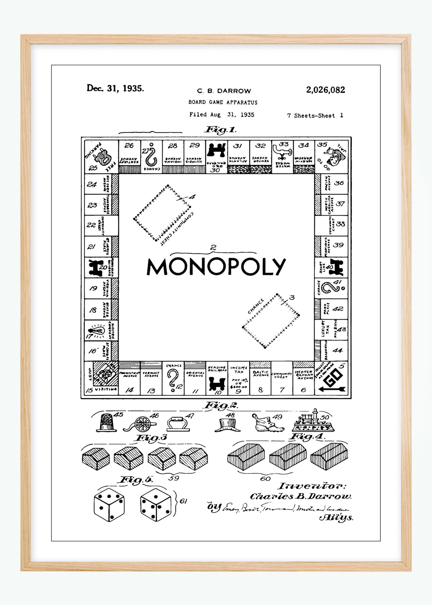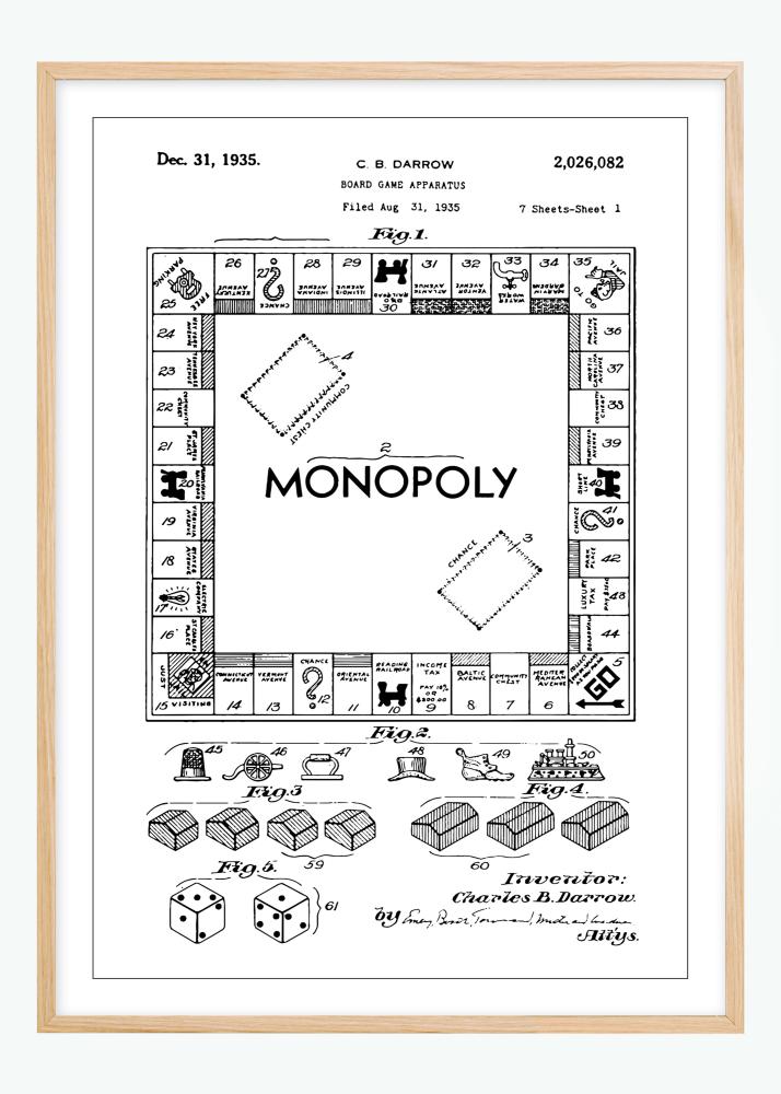 See patendi plakat kujutab armastatud lauamängu Monopoly klassikalist disaini, mis on peremeelelahutuse ja mängude kultuurisümbol. Kuupäevad näitavad, et leiutaja Charles B. Darrow taotles patenti 31. augustil 1935 ja see anti 31. detsembril samal aastal numbriga 2,026,082. Detailne joonis esitab ülevaate mängulauast, mis on täielik tuntud "mine", "võimalus" ja kinnisvara ruutudega, samuti ikooniliste mängunuppude ja täringutega, pakkudes nostalgilist tunnet ja hinnangut sellele ajatu mängule.