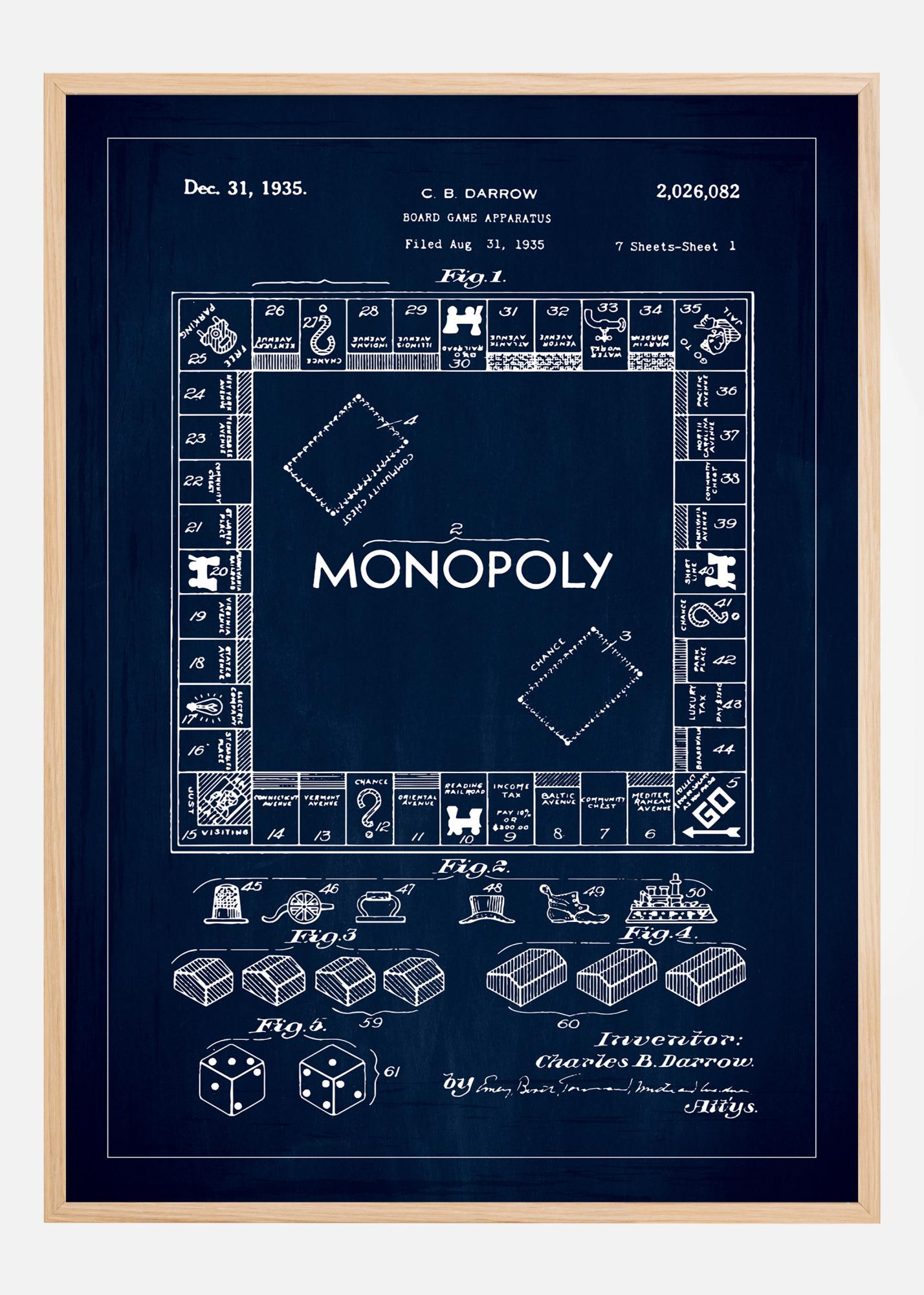 Toonita oma sisekujundust selle klassikalise patendipostriga, mis näitab patenti number 2,026,082 armastatud lauamängule Monopoly, mille lõi C. B. Darrow ja mis patenteeriti 31. detsembril 1935. Detailne illustratsioon hõlmab kõiki mängu aspekte, alates mängulauast koos selle kinnistute ja raudteedega kuni eripäraste mängunuppude ja täringuteni, kõik elegantsel tumesinisel taustal.