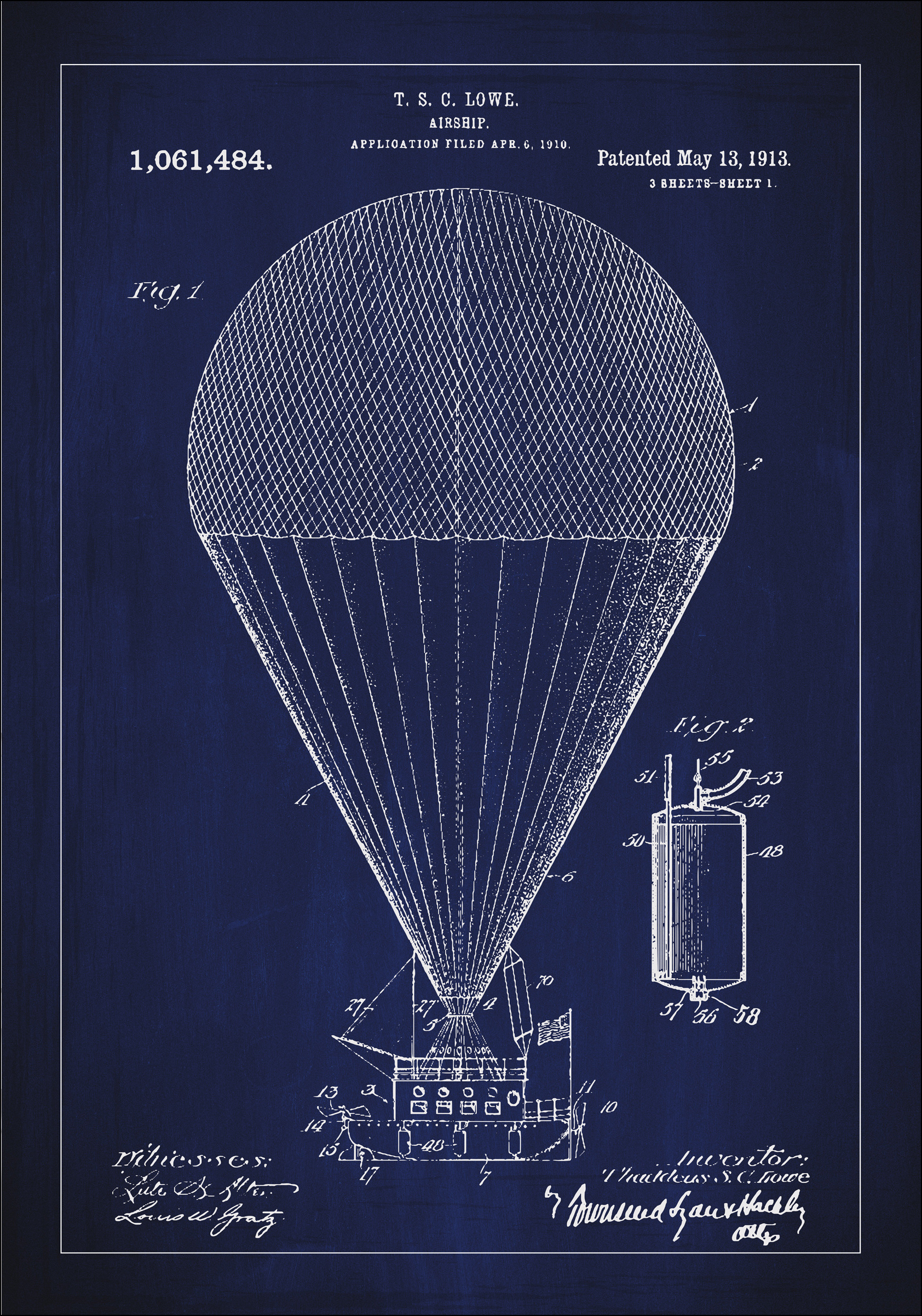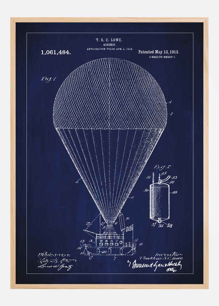 Meil on au esitleda seda patentijoonist, mis kujutab T. S. Lowe õhulaeva, leiutist, mis tähistas sammu edasi varajases lennunduses. Patent number 1,061,484 anti välja 13. mail 1913 ja see kannab endas ajastu seiklusvaimu ja innovatsiooni. See plakat on austusavaldus 1900. aastate alguse loomingulisele vaimule ja tehnilistele unistustele.