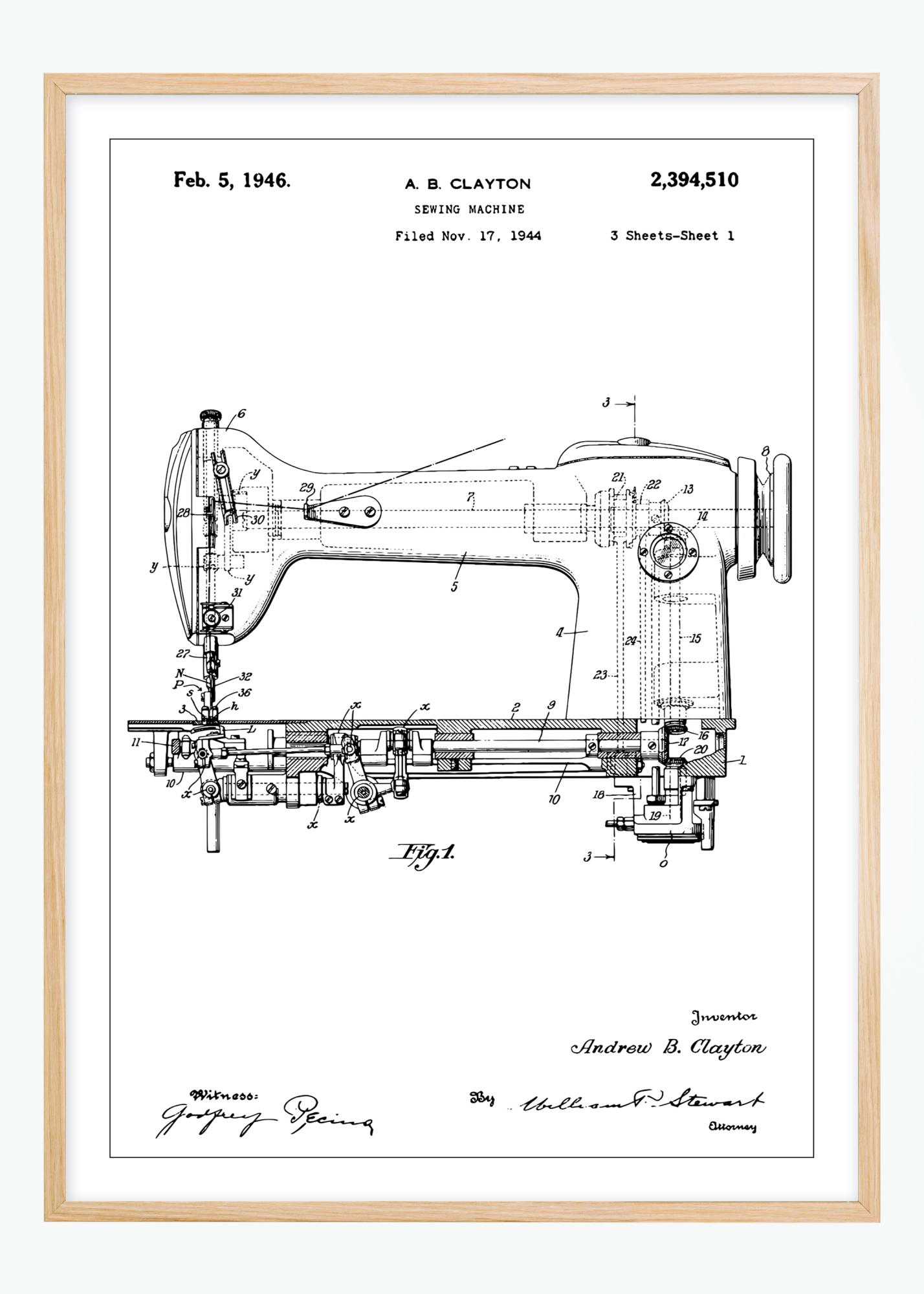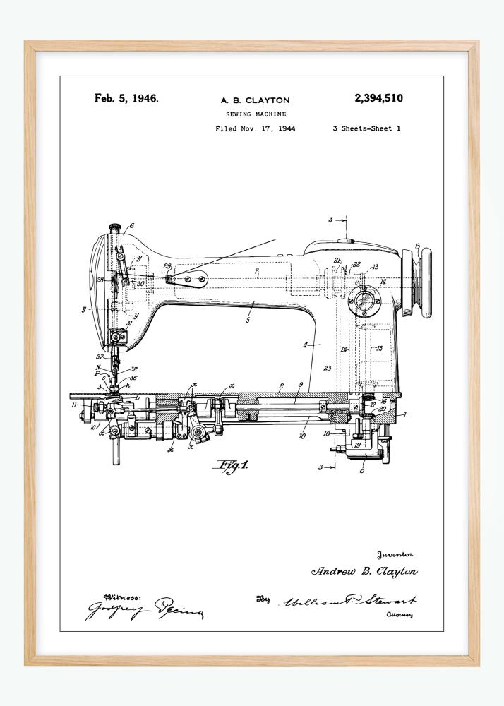 Selle üksikasjalik patendijoonis õmblusmasinast on ideaalne illustratsioon tööstuslikust kunstist ja innovatsioonist, mille autoriks on leiutaja Andrew B. Clayton. Autoriõigus on dateeritud 5. veebruaril 1946 ja arhiveeritud 17. novembril 1944, see patentplakat kujutab klassikalist käsitööd ja täpsust, mis seisneb masinõmbluses. Oma keeruliste komponentide ja tehniliste joontega pakub see patendi plakat ainulaadset pilguheitu 1900. aastate alguse tehnilisele arengule ja on stiilne sisustuselement kõigile, kes hindavad ajaloolist innovatsiooni.