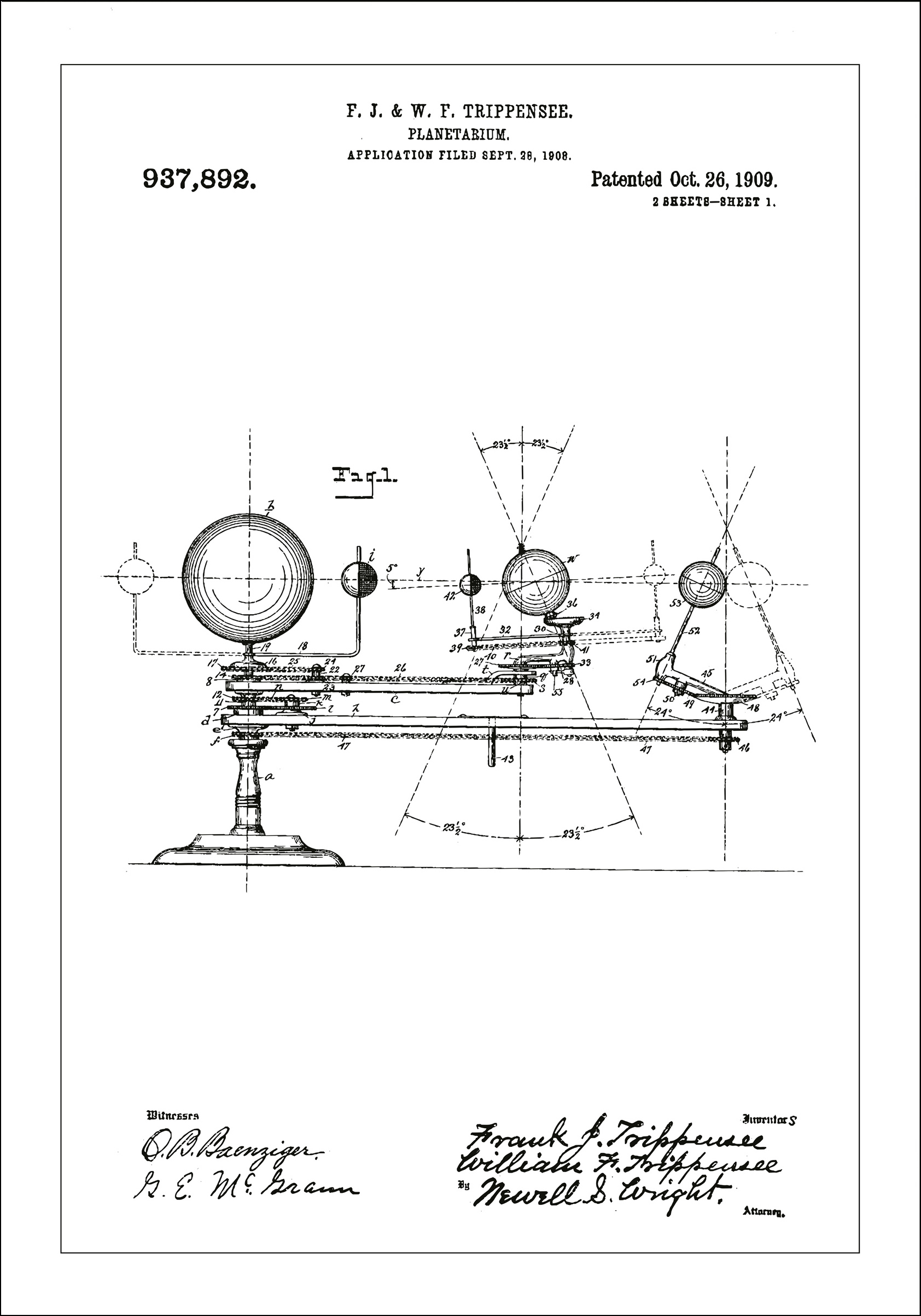 See elegantne patendiplakat on austusavaldus insenerikunstile ja taevakehade uurimisele, pakkudes detailset kujutist F. J. & W. F. Trippensee planeetariumist, mis on klassikaline leiutis varajasest 20. sajandist. Patent, number 937,892, registreeriti 26. oktoobril 1909, ja taotlus esitati 28. septembril 1908. See kunstiliselt kujutatud patendidokument on ainulaadne sisustuselement, mis pakub nii ajaloetundi kui ka vestluse alustajat. See on ideaalne teadushuvilistele või kodu, kontori või klassiruumi akadeemilise tunnetuse loomiseks.