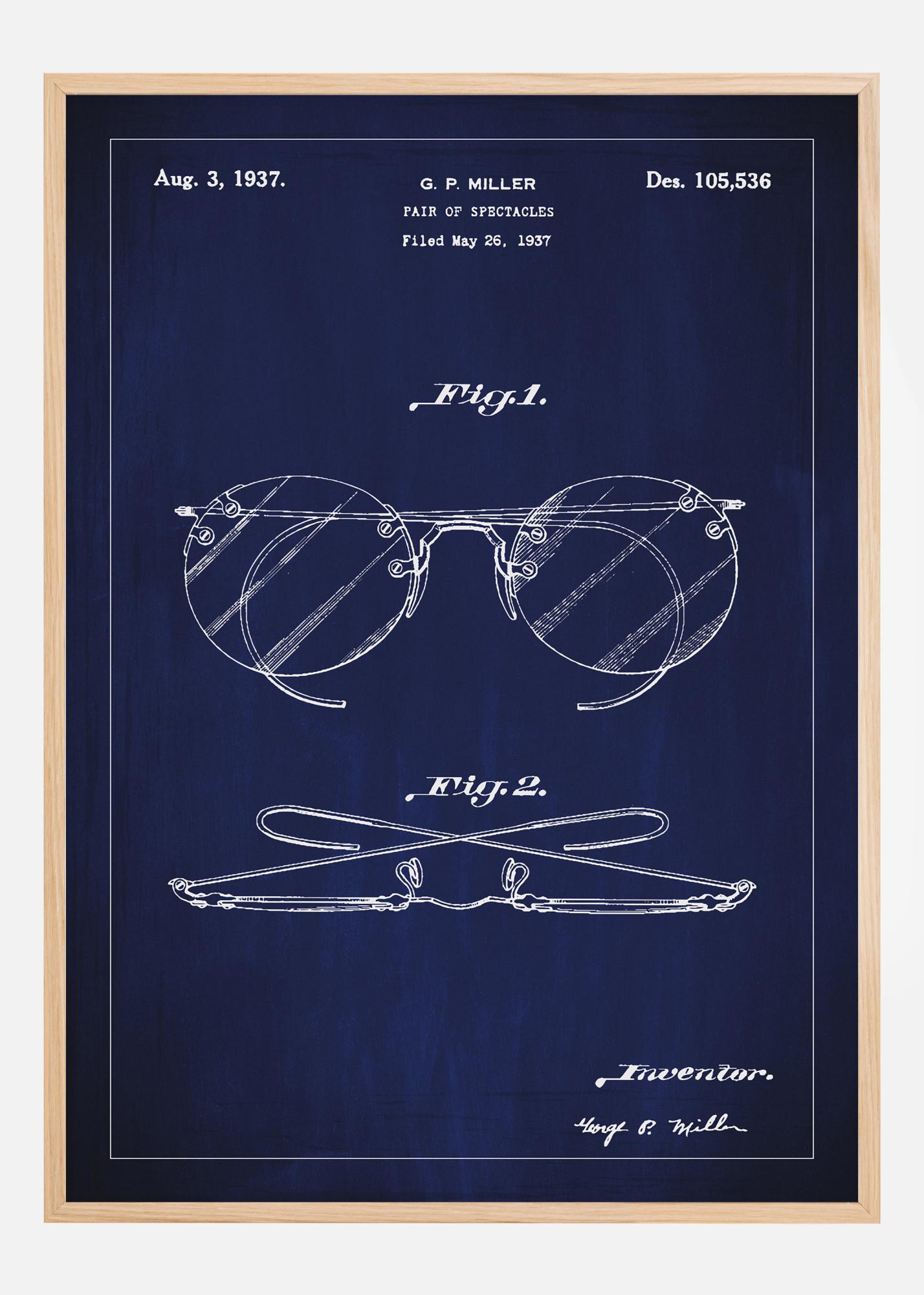 See patendiplakat pakub elegantset esindust G. P. Milleri disainile prillide paari jaoks, mis on dokumenteeritud disainpatendi numbriga 105,536, väljastatud 3. augustil 1937. Läbimõeldud jooned ja selge kujundus püüavad kinni selle igapäevase eseme klassikalise stiili ja funktsionaalsuse. See konkreetne prillide kujundus esindab optika ja disaini ajastut, muutes selle patendi joonise ainulaadseks ja rafineeritud seinakaunistuseks.