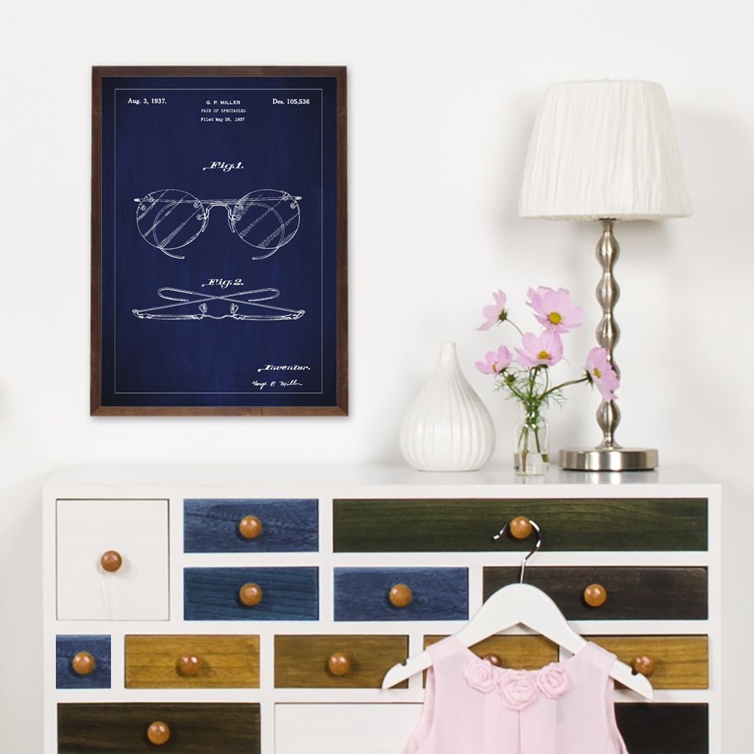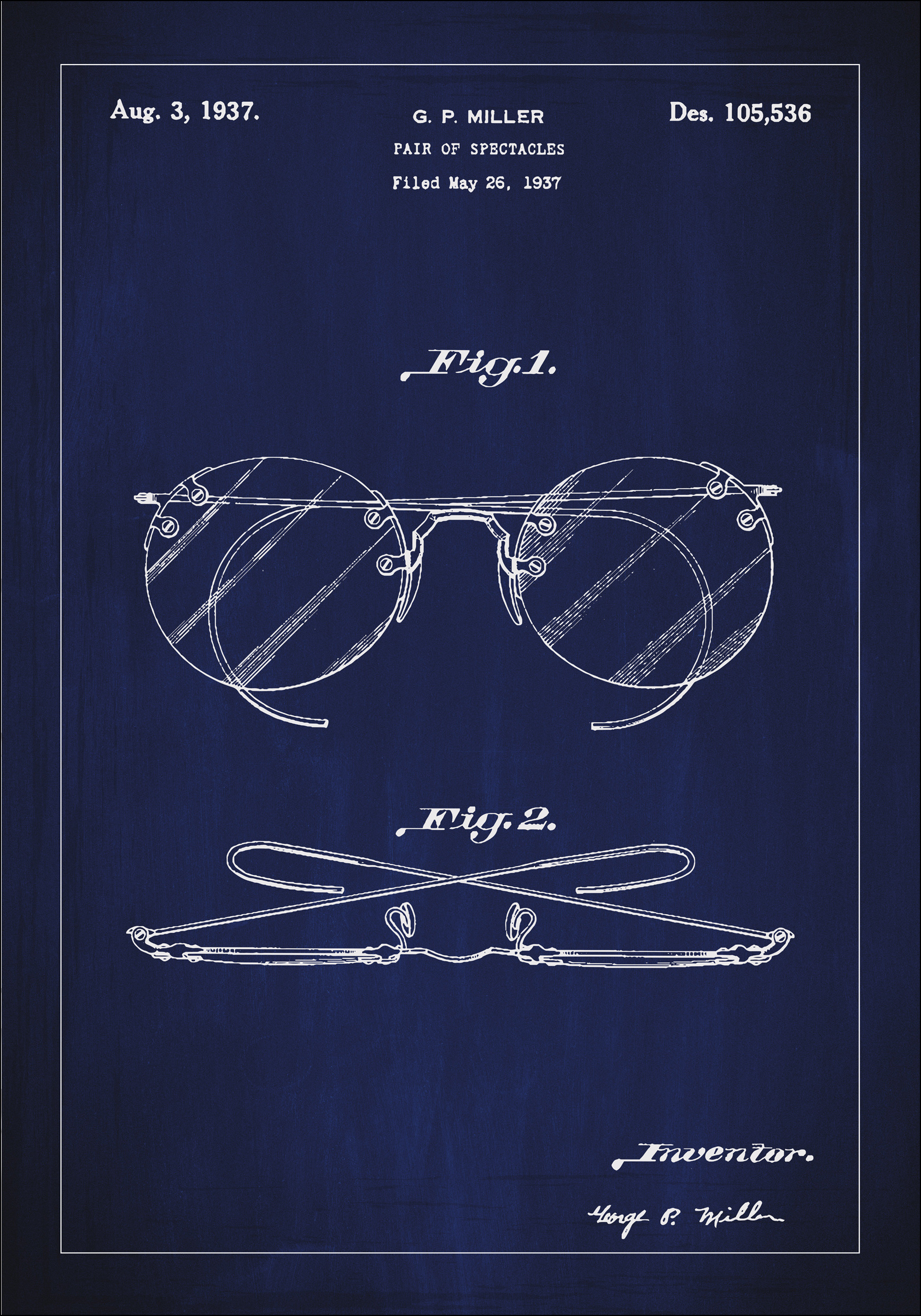 See patendiposter pakub elegantset esitust G. P. Milleri prillide disainist, mida dokumenteeritakse disainipatendi numbriga 105,536, mis anti välja 3. augustil 1937. Läbimõeldud jooned ja selge kujundus püüavad selle igapäevaeseme klassikalise stiili ja funktsionaalsuse. See prillide konkreetne disain esindab ajajärku optikas ja disainis, muutes selle patendijoonise ainulaadseks ja rafineeritud seinakaunistuseks.
