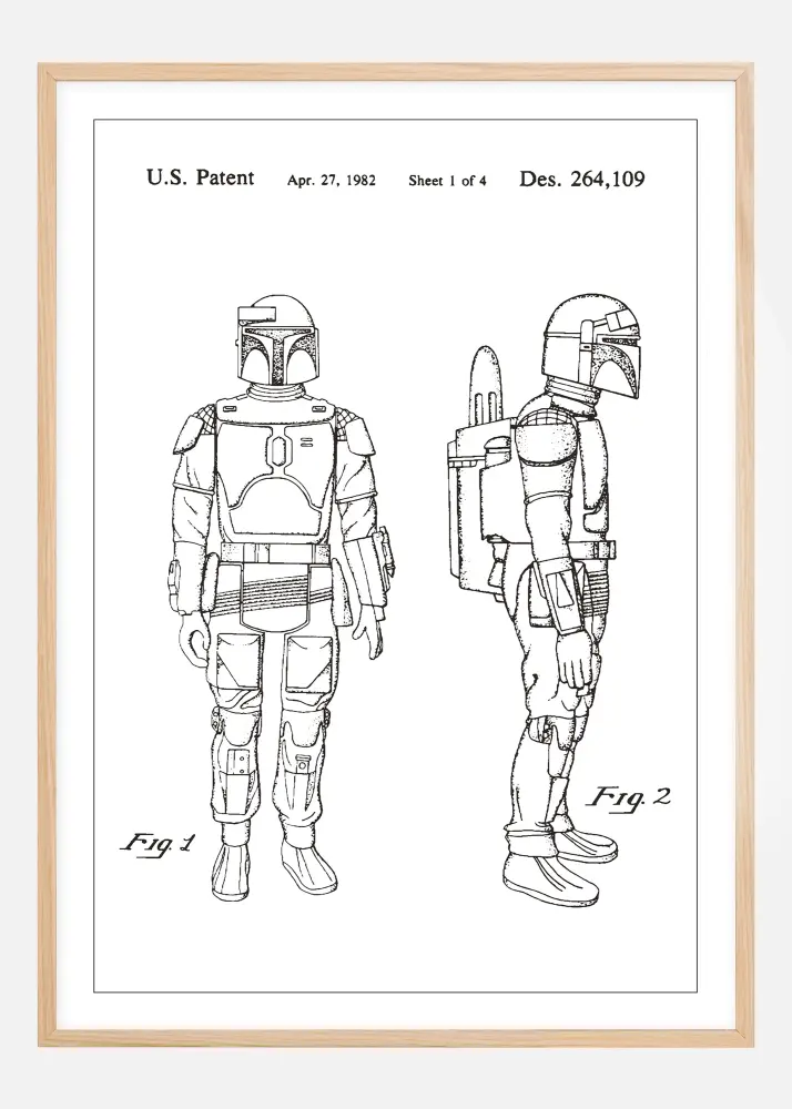 Imponeeri tükiga ajaloost oma seinal, kasutades seda peenelt kujundatud patentplakatit, mis kujutab ikoonilist Boba Fett'i turvisekostüümi Tähesõdade filmist. Kavandatud seiklusteks väljaspool tavalist. See täpne Ameerika patendi reproduktsioon, numbriga Des. 264,109 ja dateeritud 27. aprill 1982, on austusavaldus ajatu innovatsiooni ja disainigeeniuse jaoks. Ideaalne, et lisada kunstilist ja tööstuslikku hõngu kontorisse või kodukogusse, innustades keskkonda, mis on täis inspiratsiooni ja loovust.