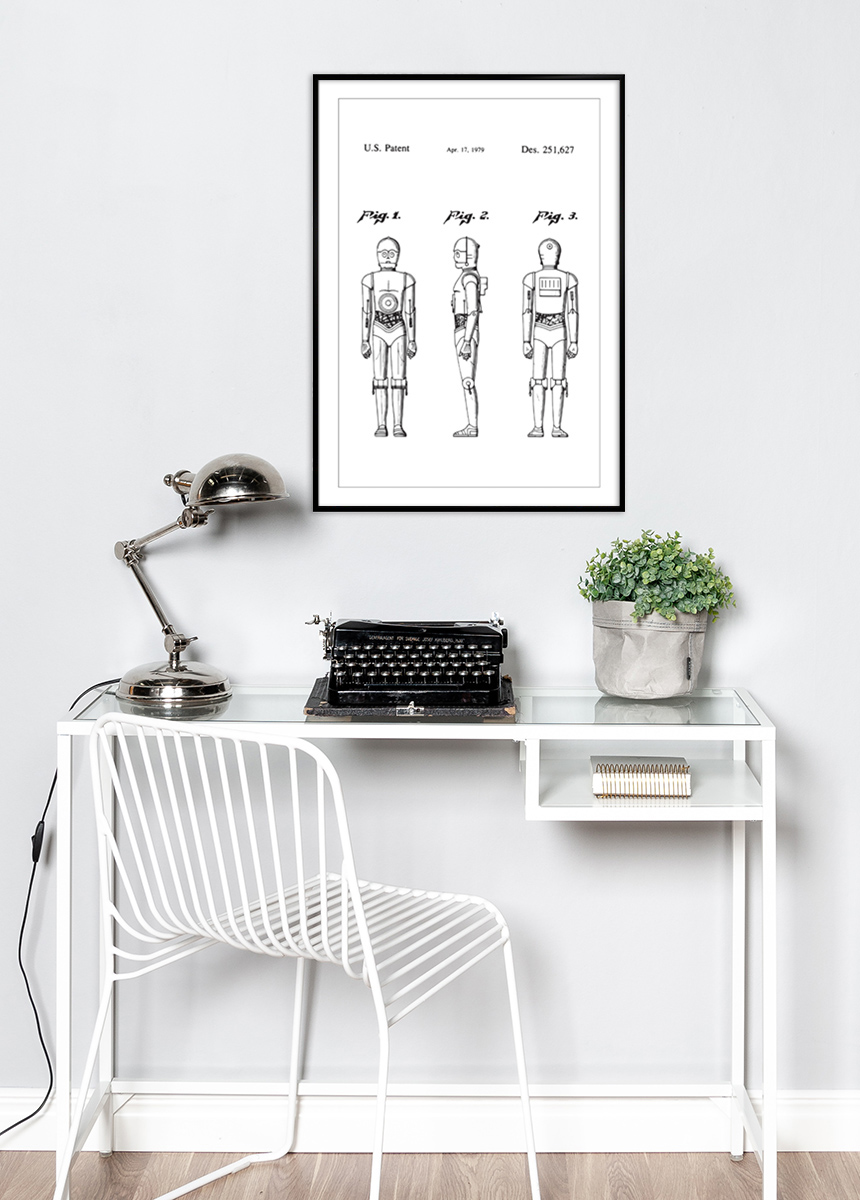 See ainulaadne patendiplakat kujutab Star Warsi C3PO-d, millele on antud USA patent Des. 251,627, välja antud 17. aprillil 1979. Kuju on kujutatud kolmest eri vaatenurgast, pakkudes täielikku ülevaadet disainist. See plakat kajastab varajast huvi robootika vastu ja selle potentsiaalset kasutusala. Oma detailse ja tehniliselt kujundatud pildiga on see ideaalne seinakaunistus tehnikahuvilistele ja retrofuturismi fännidele.