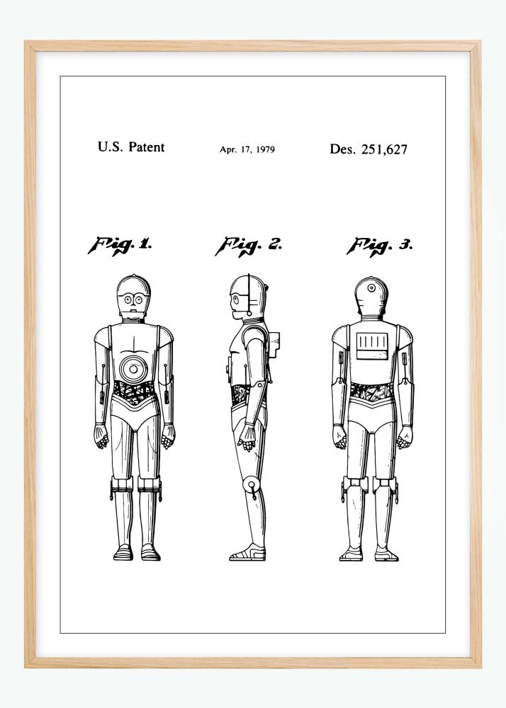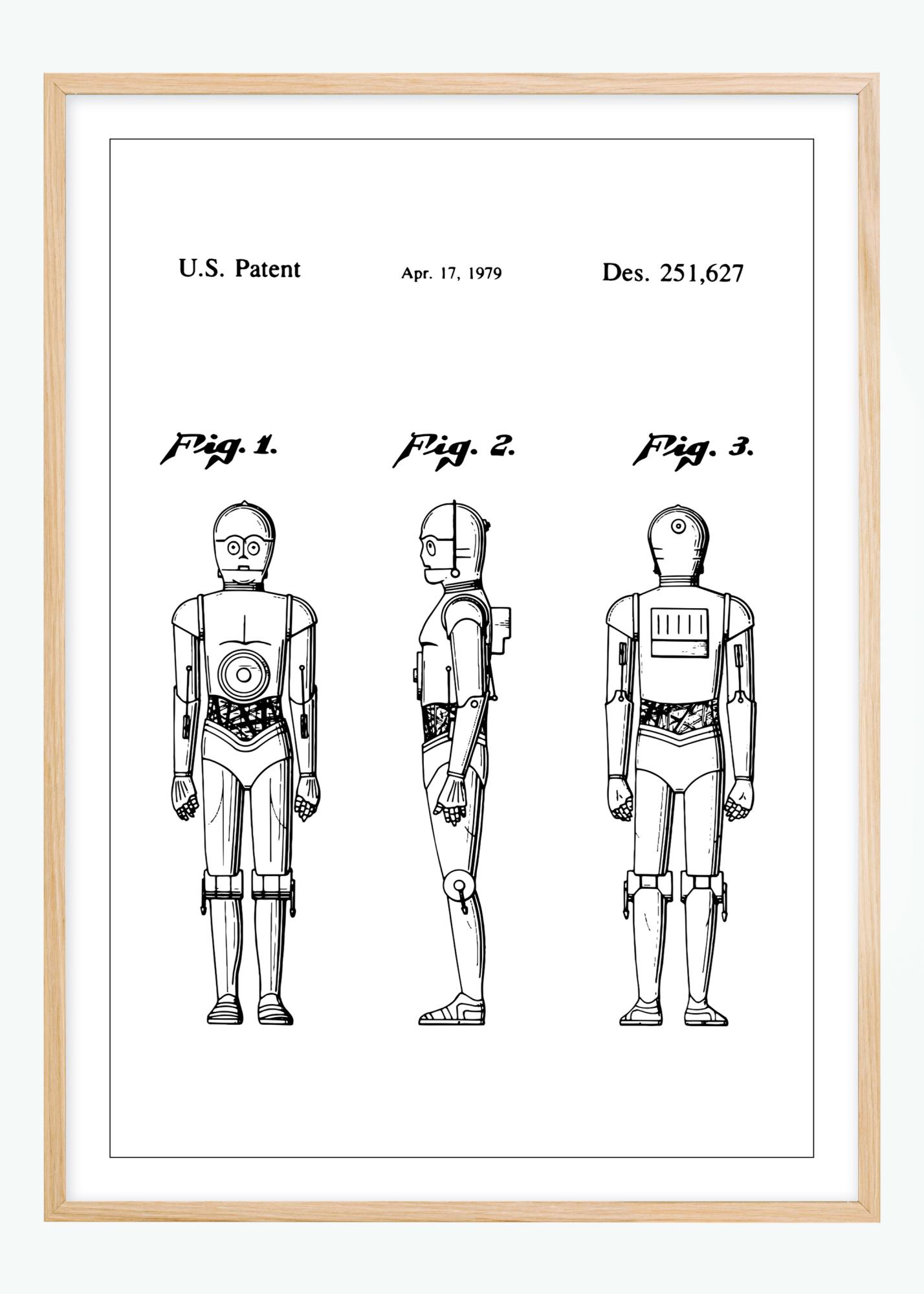 Selle ainulaadse patendiplakatil on kujutatud C3PO StarWarsist, Ameerika Ühendriikide patent Des. 251,627, väljastatud 17. aprillil 1979. Kujund on kujutatud kolmest erinevast vaatenurgast, pakkudes täielikku ülevaadet disainist. See plakat haarab varajast huvi robottehnoloogia vastu ja selle potentsiaalseid kasutusvõimalusi. Oma detailirohke ja tehniliselt koostatud pildiga on see ideaalne seinakaunistus tehnoloogiahuvilistele ja retrotuleviku fännidele.