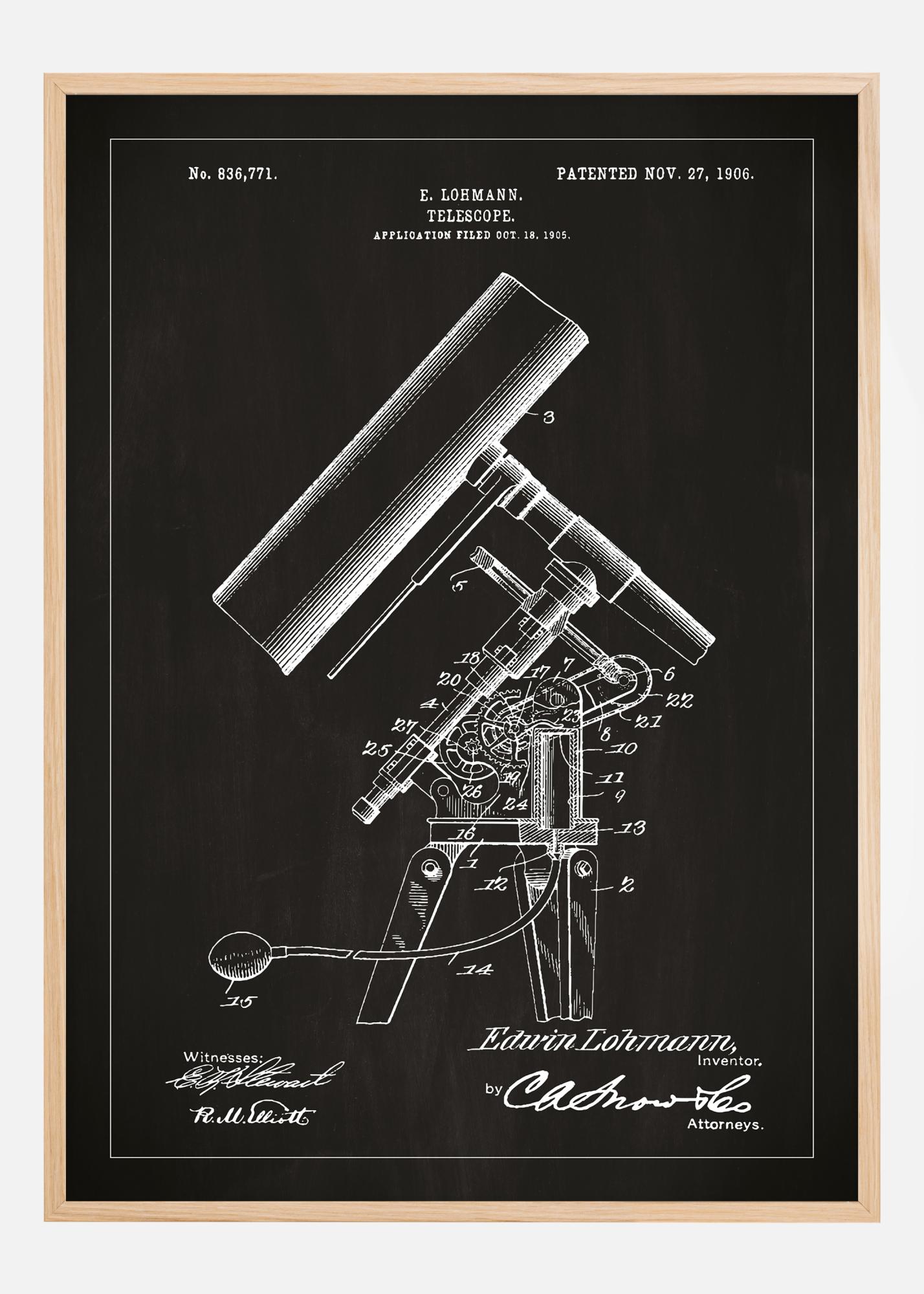 See detailne patentplakat esitleb E. Lohmanni teleskoopi, patenteeritud 27. novembril 1906, patendinumbriga 836,771. Illustratsioon hõlmab teleskoobi keerukat mehaanikat ja täppismehaanilisi detaile hoolika täpsusega. Plakati julge kontrast keeruliste joonte ja tumeda tausta vahel muudab selle pilkupüüdvaks sisekujunduselemendiks, mis samal ajal austab astronoomia ja optika rikkalikku ajalugu. See on põnev austusavaldus 1900. aastate alguse teaduslikele edusammudele ja inspireeriv pilgupüüdja kõigile teaduse entusiastidele.