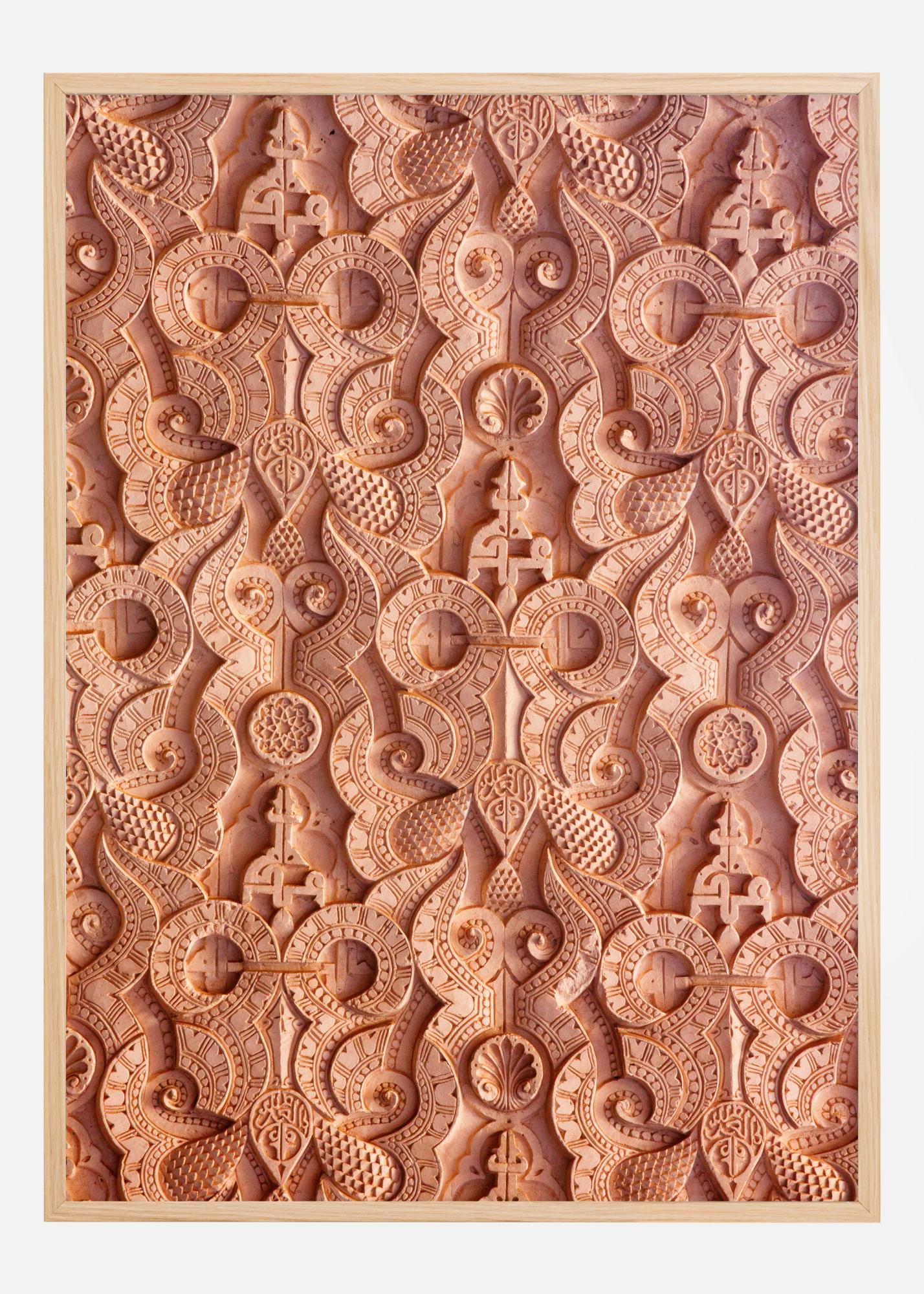 Motiivi värvid jäävad sooja terrakota ja savi paletti, pakkudes loomulikku ja rustikaalset tunnet. Detailne muster paistab hästi silma ühtlase tausta peal ja loob kolmemõõtmelise illusiooni, mis on nii köitev kui ka sügav. See plakat on ideaalne neile, kes hindavad kunsti, mis püüab pilku ja kutsub lähemalt uurima, ning väärtustavad käsitööd ja traditsiooni oma sisustusstiilis.