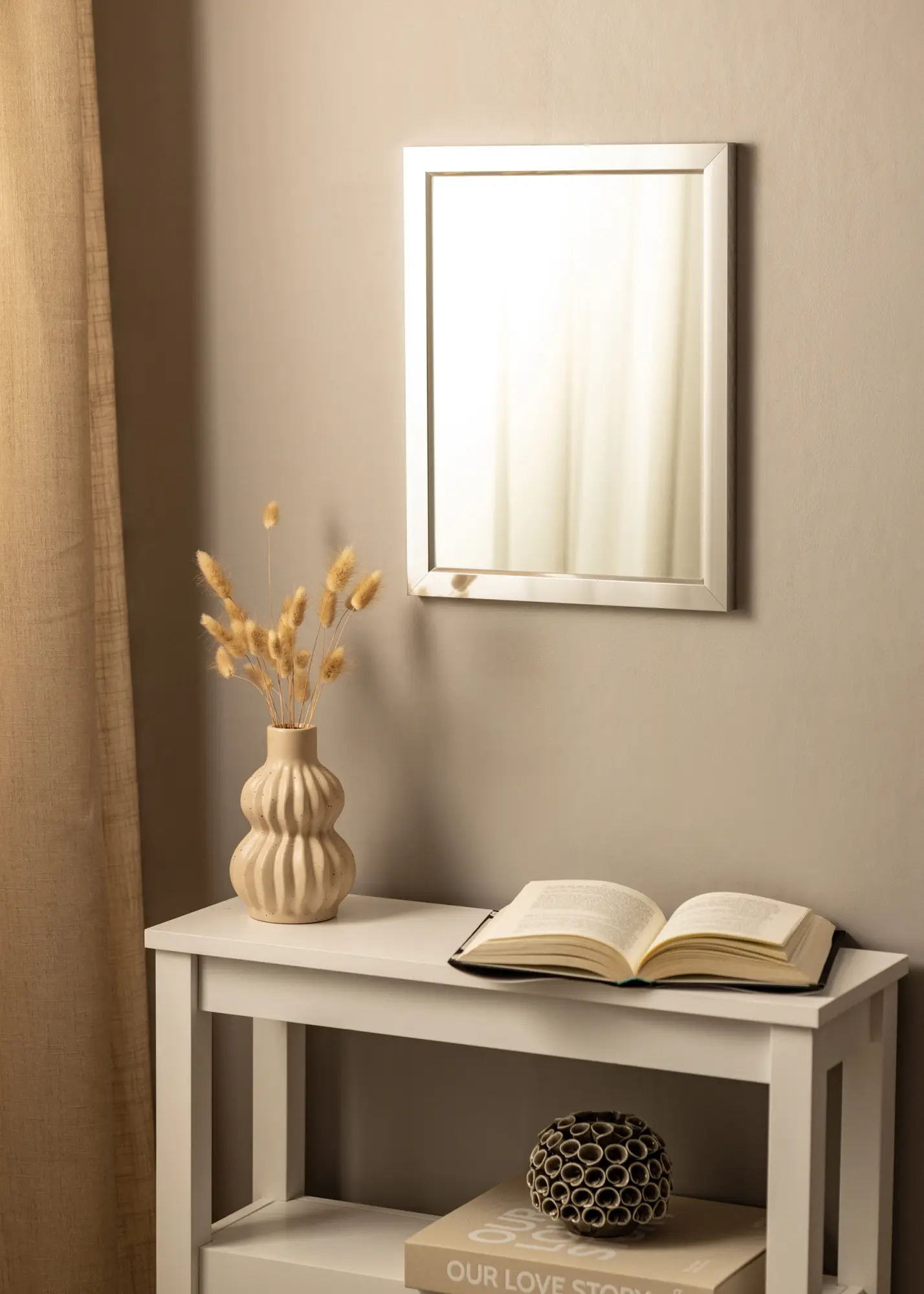 Vinge stiilne peegel kõrgläikega hõbedase raamiga, millel on peegliklaasi tunnetus. Raam on valmistatud Saksamaal alumiiniumist ning on kõrge kvaliteediga. Peegli raami kõrgläikega välimus tõmbab pilku ja peegeldab valgust efektiivselt, mis on kasulik, kui soovite peeglit kasutada, et tuua valgust pimedasse ruumi. Peegli puhas vormikeel sobib hästi nii minimalistlikku moodsa interjööri kui ka koju, kus segatakse nii uut kui vana.