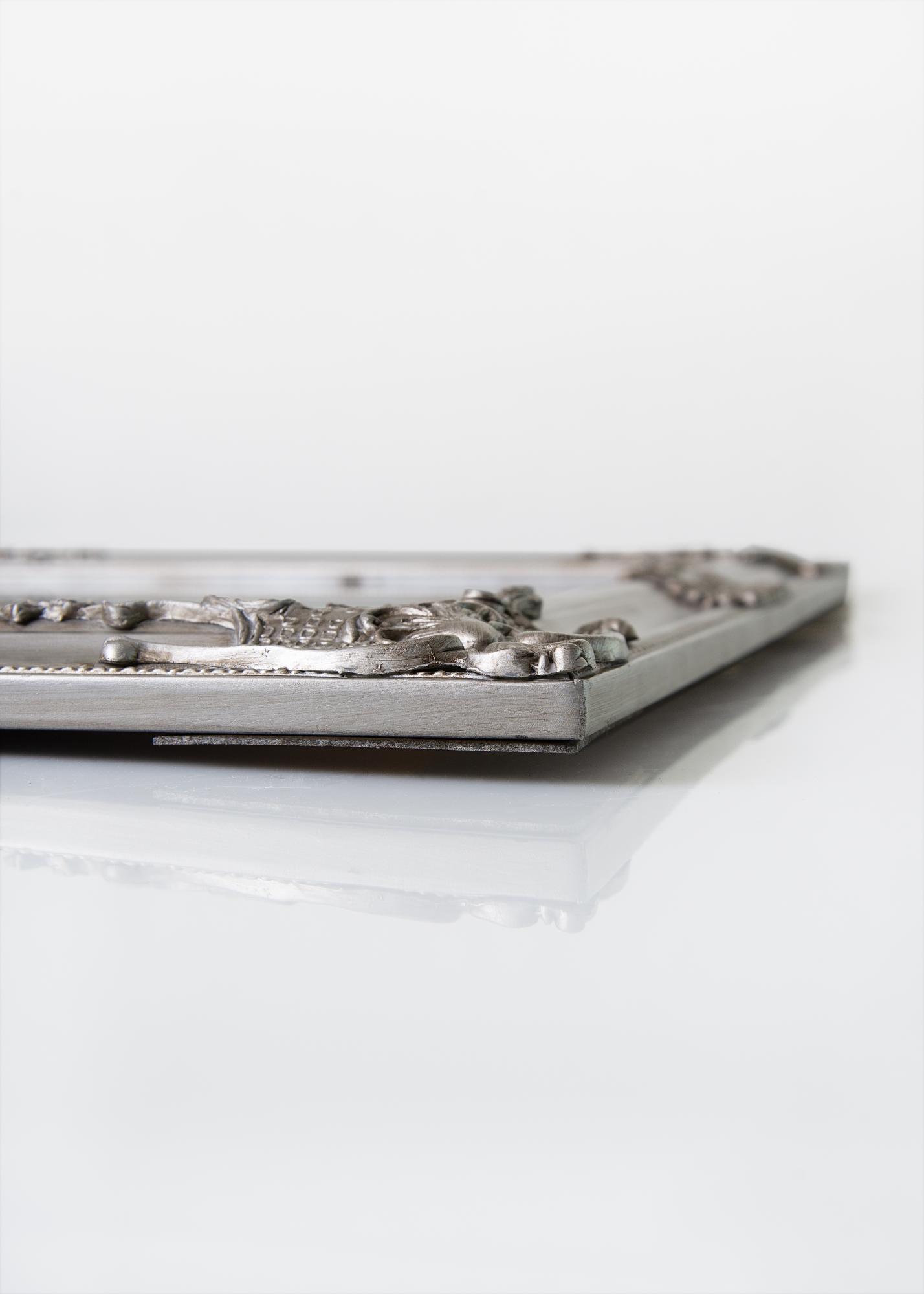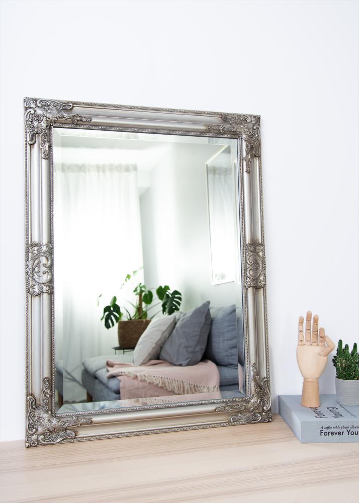 Bologna Hõbedane peeglite sari on ladina disainiga, rikkaliku dekoratsiooniga nurkades ja raamipoolte keskpunktides. Veidi kitsam raam kui paljudel teistel selle stiili peeglitel. Raam on valmistatud puidust ja dekoratsioon on valatud kipsist, enne kui see raamile kantakse.