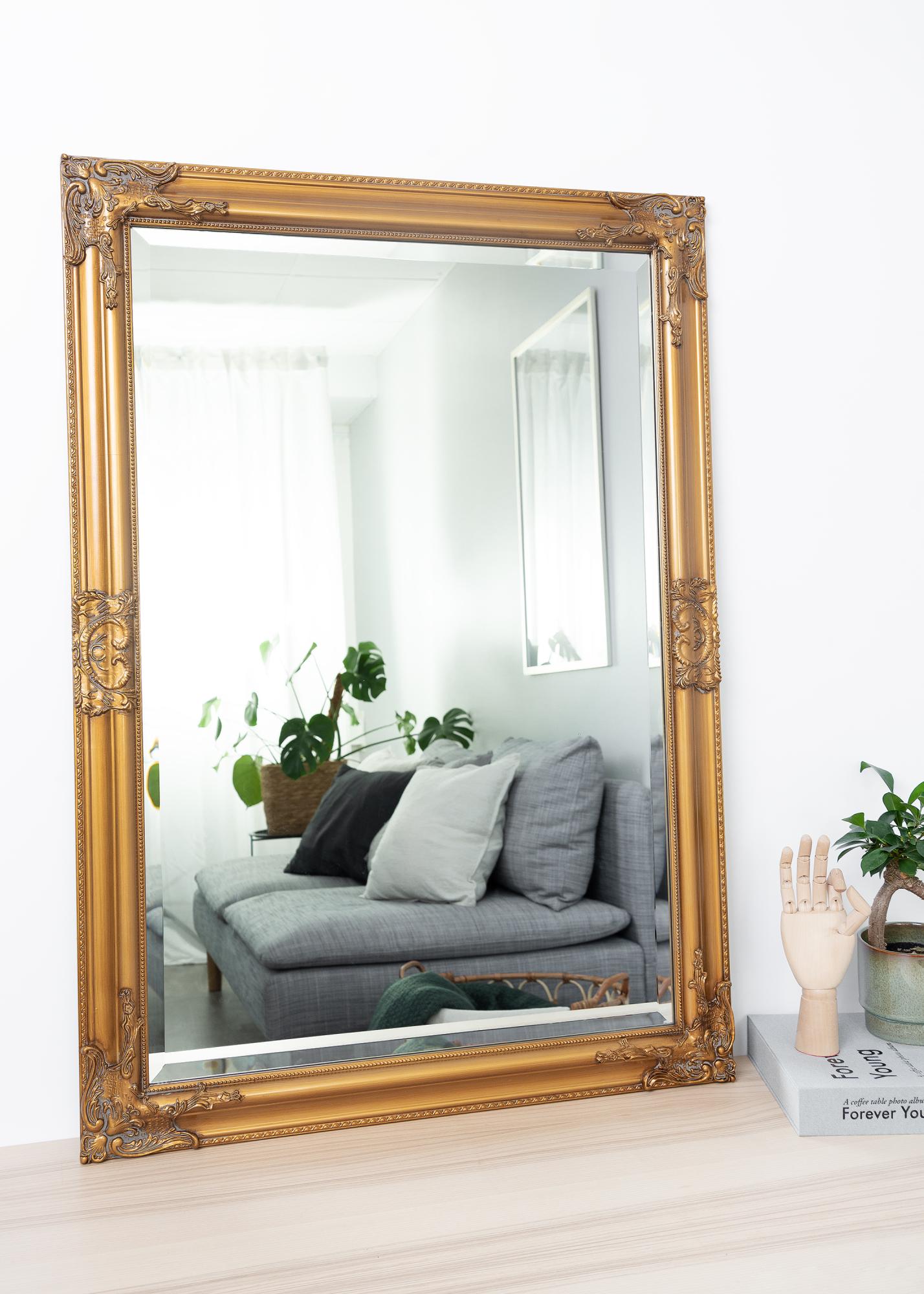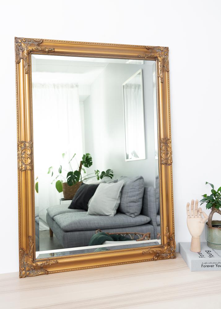 Peeglite seeria Bologna Kuld on ladinapärase disainiga ja rikkaliku dekoratsiooniga nurkades ja raami keskpunktides. Veidi kitsam raam kui paljudel teistel selle stiiliga peeglitel. Raam on valmistatud puidust ja dekoor on vormitud kipsist enne, kui see raamile kanti. Sobib suurepäraselt kui vannitoa peegel.