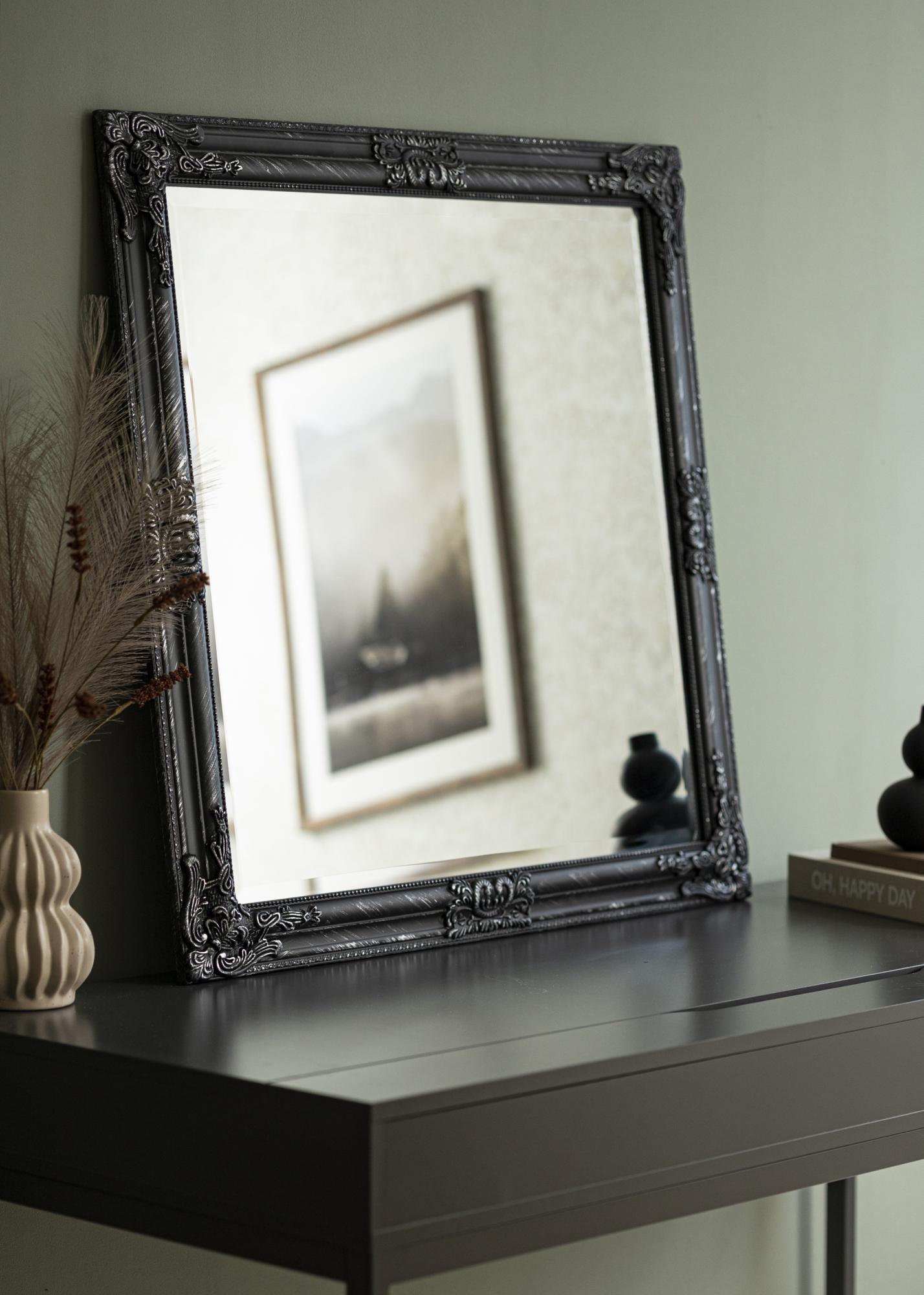 See peegel paistab silma ruudukujulise vormiga, mis loob ruumis struktuuri ja korda, ümbritsetud tumeda, detailirikka raamiga, mis annab väljendusrikka ja rafineeritud stiili. Must raam on kaunistatud peente detailidega, mis viivad mõtteid baroki küllusliku esteetikani, lisades teie interjöörile luksusliku ja dramaatilise aktsendi.