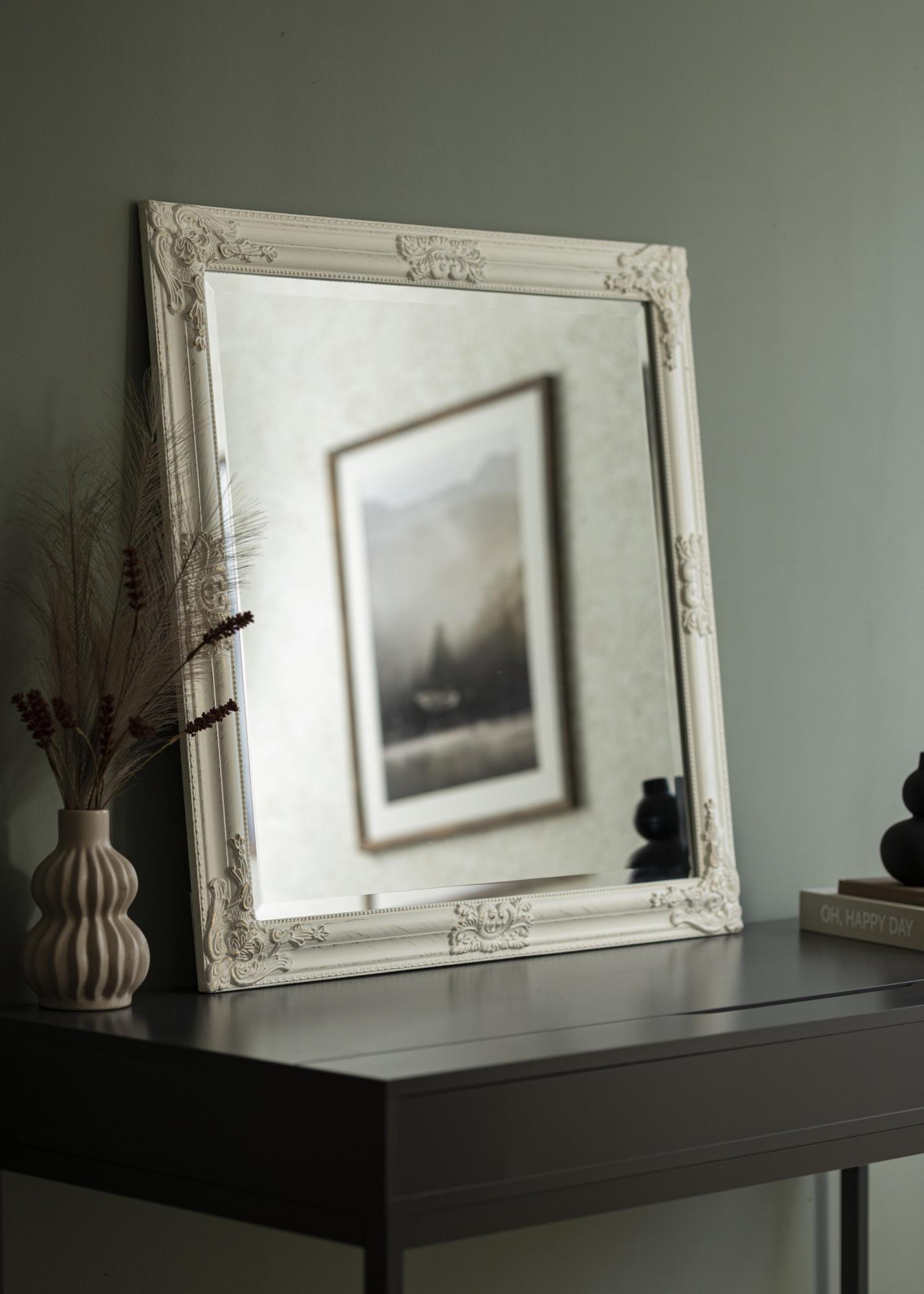 Avasta elegantne nelinurkne peegel, mille mõõtmed on 80x80 cm, mis on ideaalne suurus, et olla nii funktsionaalne kui ka dekoratiivne sinu kodus. See peegel on nelinurkse kujuga, andes sümmeetrilise ja tasakaalustatud tunde, tehes sellest silmapaistva elemendi igas toas. Valge raam on rikkalikult kaunistatud klassika inspiratsioonist lähtuvate detailidega, luues ajatuma elegantsi ja võlu.