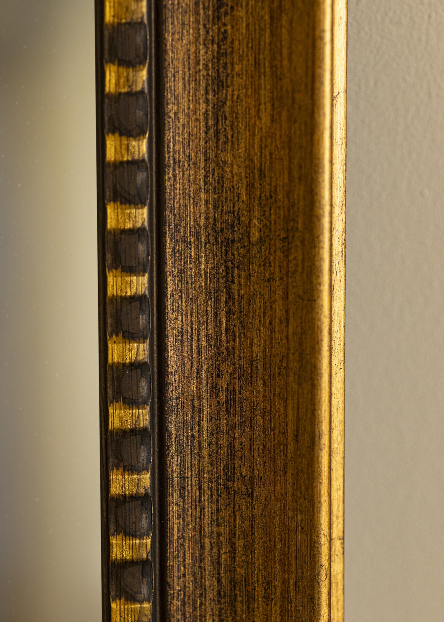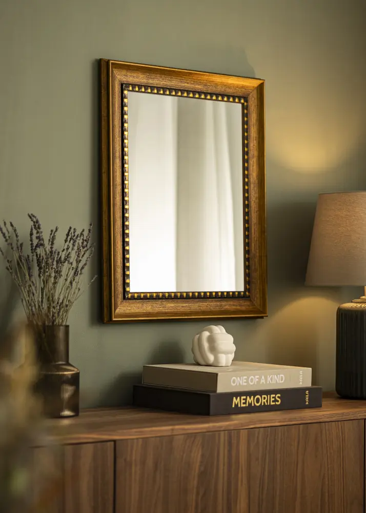 Sellel peeglil on soe pruun värv elegantse antiikviimistlusega, mis annab ruumile ajatu võlu. Lai profiil on peene läikega ja kaunistatud kuldse ja musta triibulise detailiga mööda sisemist serva. See loob ilusa kontrasti ja tõmbab pilgu peegli keskpunkti.