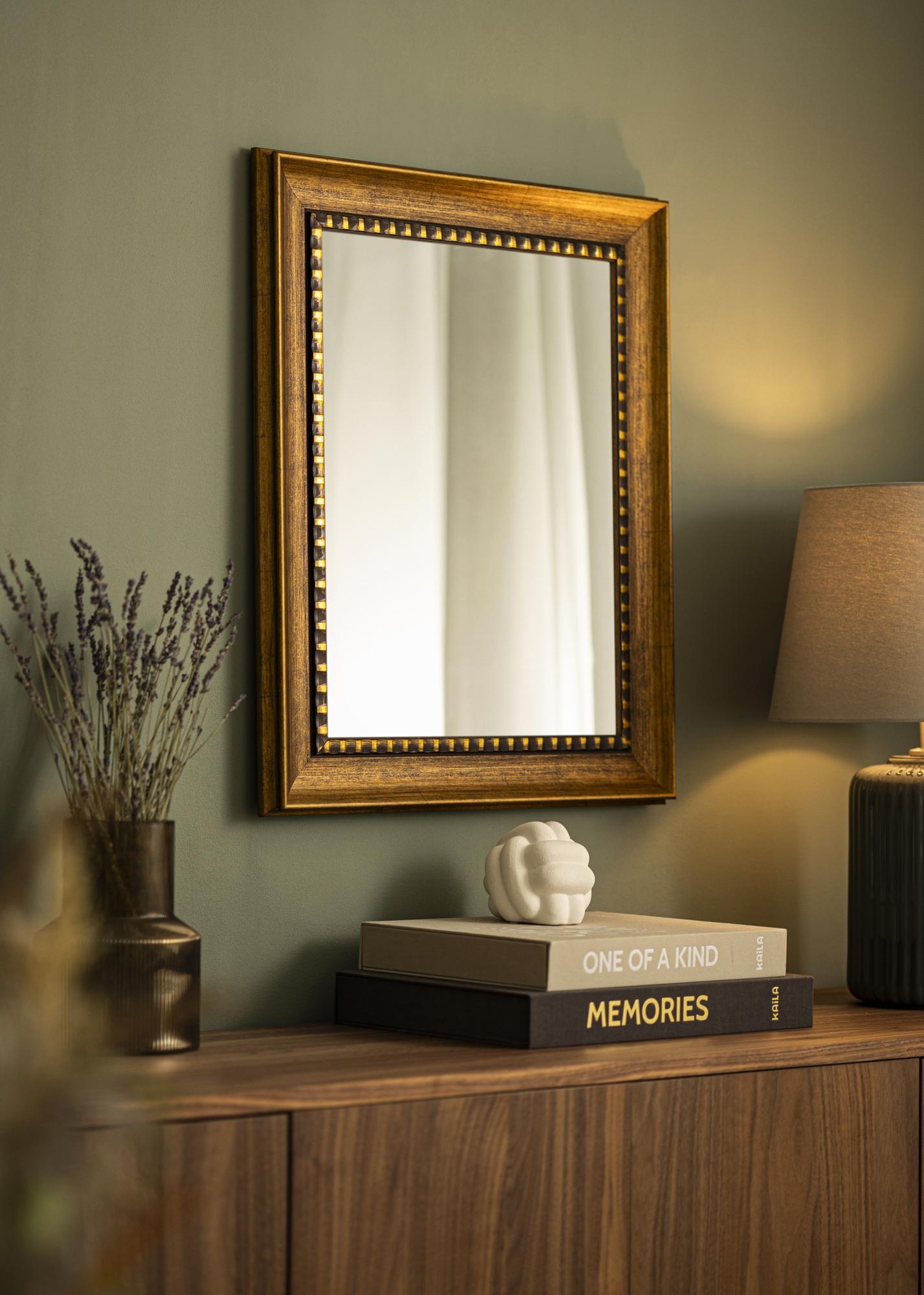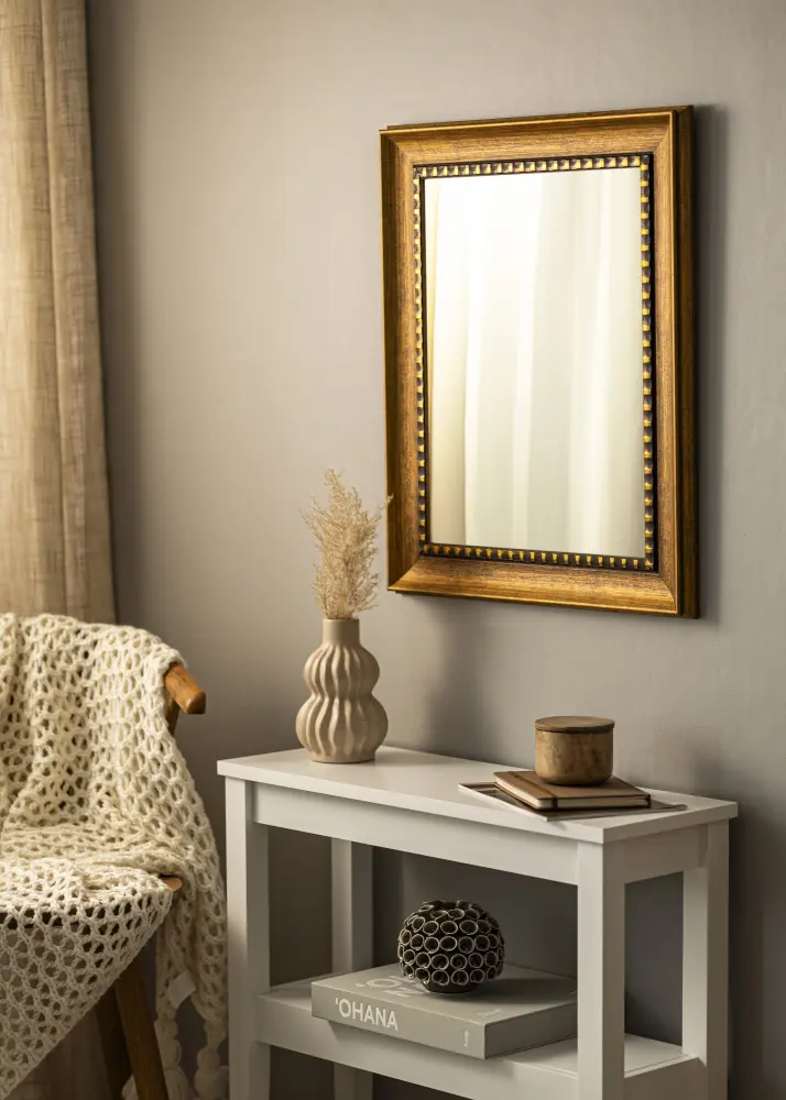 Ramas on nähtav puidustruktuur, mis annab peeglile rustikaalse tunde, mis sobib ideaalselt nii kaasaegse kui ka traditsioonilise sisekujundusega. Pehme kullavärviline äär lisab rafineeritud puudutuse, muutes peegli elegantseks elemendiks ükskõik millises ruumis.