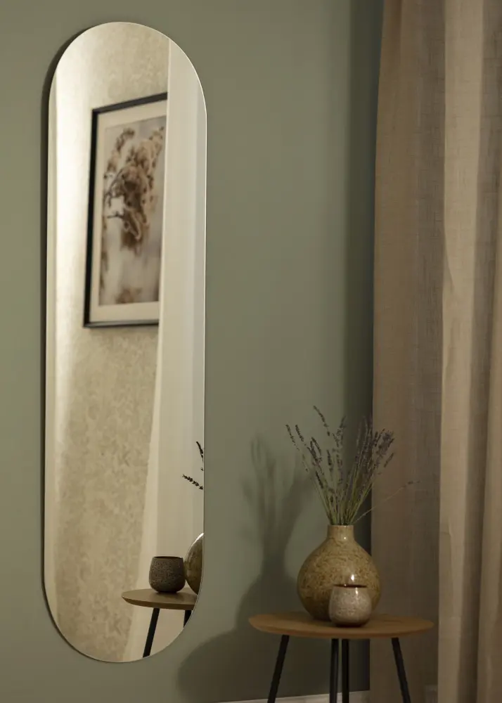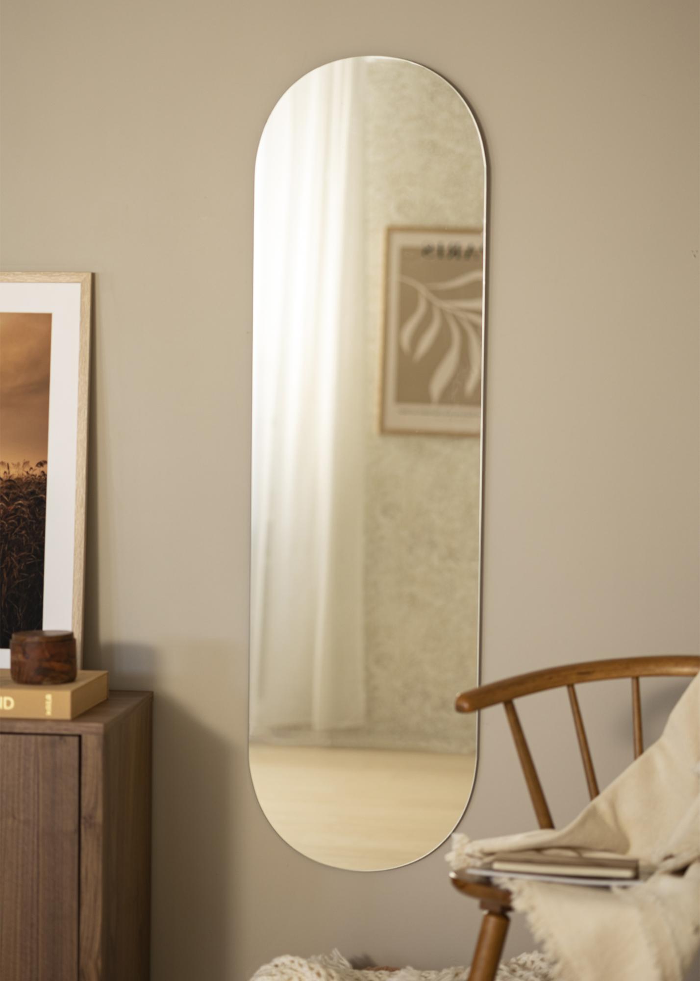 Avastage elegantne ja mitmekülgne seinapeegel, mis on loodud sobima igasse teie kodu tuppa. Oma heldete mõõtmetega 40x140 cm pakub see peegel praktilist ja dekoratiivset funktsiooni teie ruumis. Selle orgaaniline ja piklik kuju ümarate servade ja pehme kaarega ülaosas annab kaasaegse ja pehme välimuse, mis sulandub erinevatesse sisustusstiilidesse.