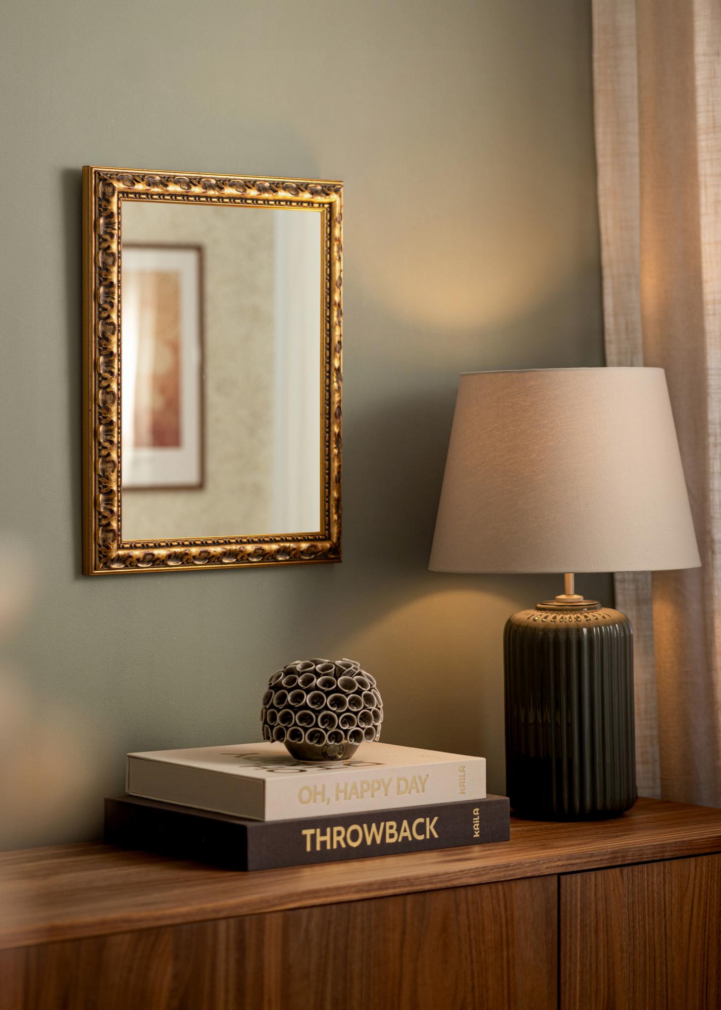 Freyja Kuld peegli raam on 38 mm lai ja 34 mm sügav, mis annab peeglile tugeva ja jõulise tunde. Valmistatud männipuust, ühendab see vastupidavuse ja klassikalise esteetika. Vanutatud viimistlus tumedate patineeritud detailide ja peente punaste aktsentidega tugevdab peegli rustikaalset iseloomu ja annab sellele ajatult võluva ilme.