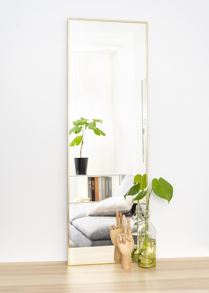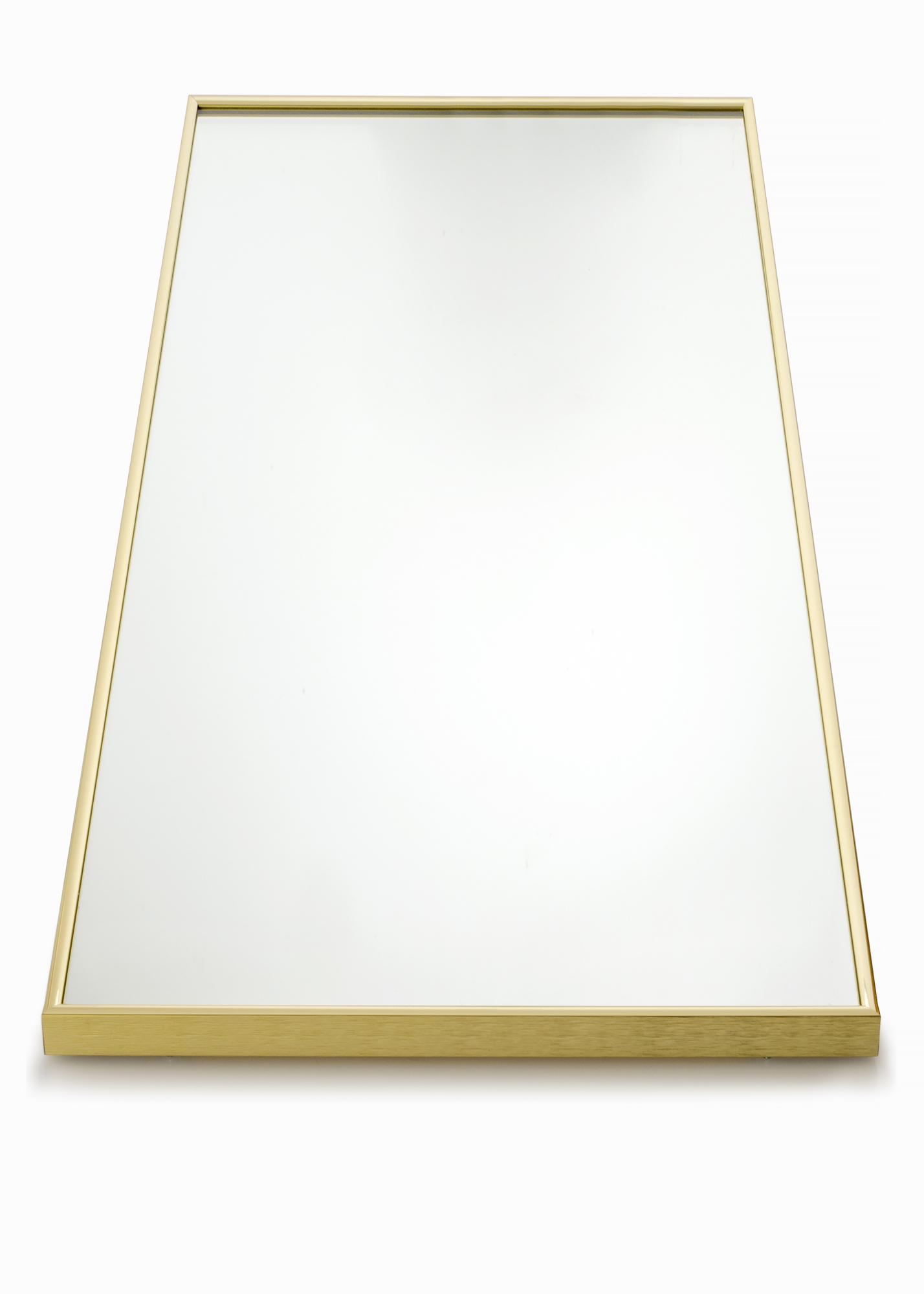Peegel on kullavärvi alumiiniumraamiga ja riputatakse lihtsalt seinale tänu nutikatele seinakinnitusdele. Mõõdud: 40x120 cm