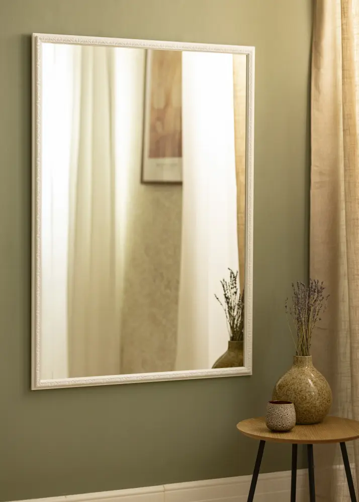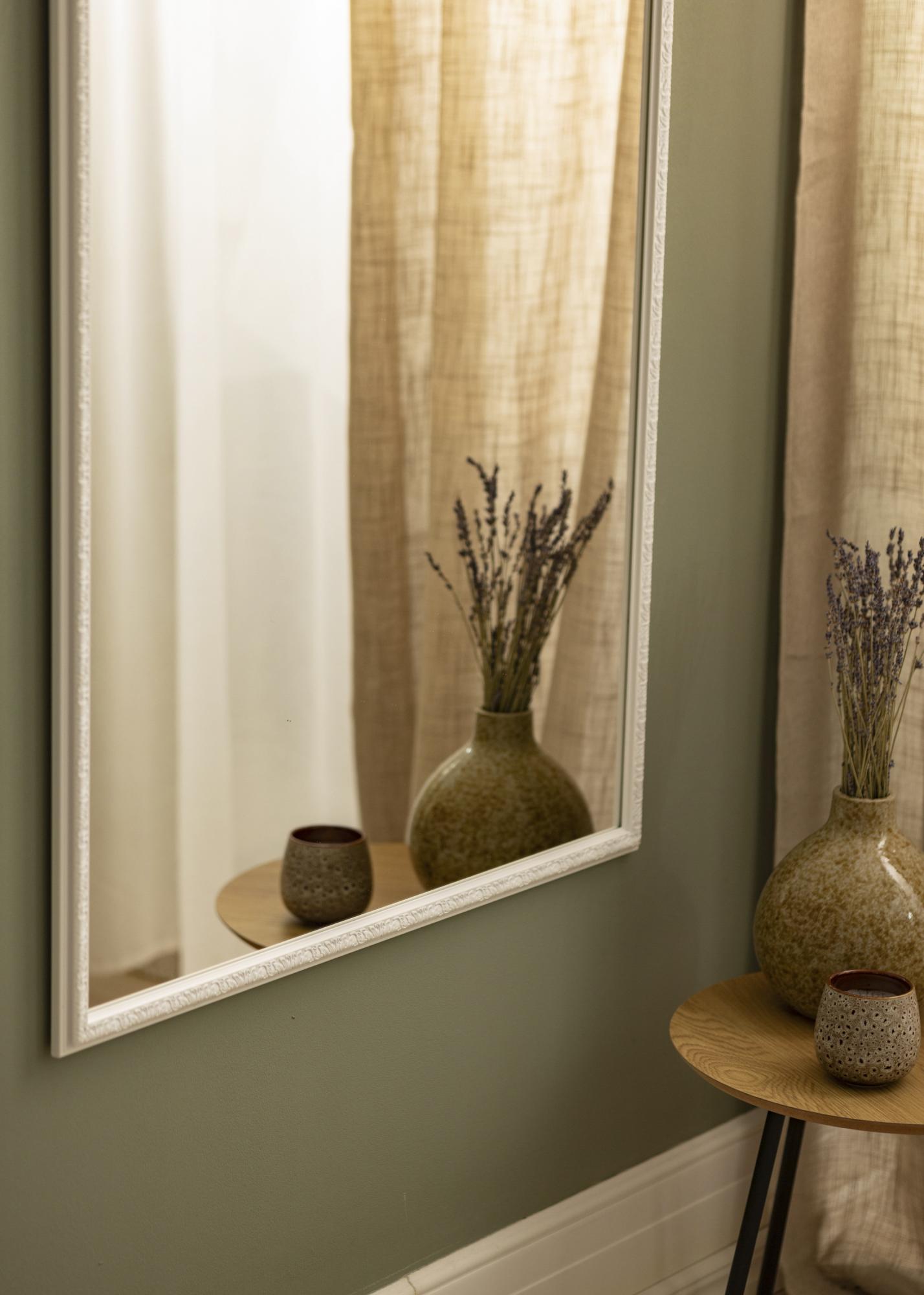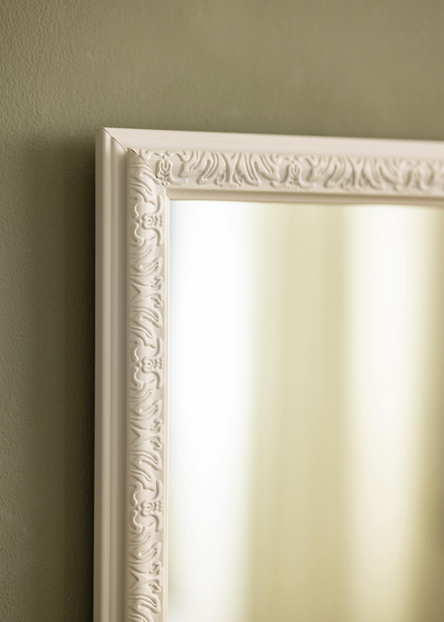 See seinapeegel on stiilne sisustuselement, mis peegeldab kaunilt ruumi kõikide valgusallikate valgust. Valge raamilatt annab kerge ja värske mulje, mida täiendavad ideaalselt raami dekoratiivne profiil ja kaunid mustrid.