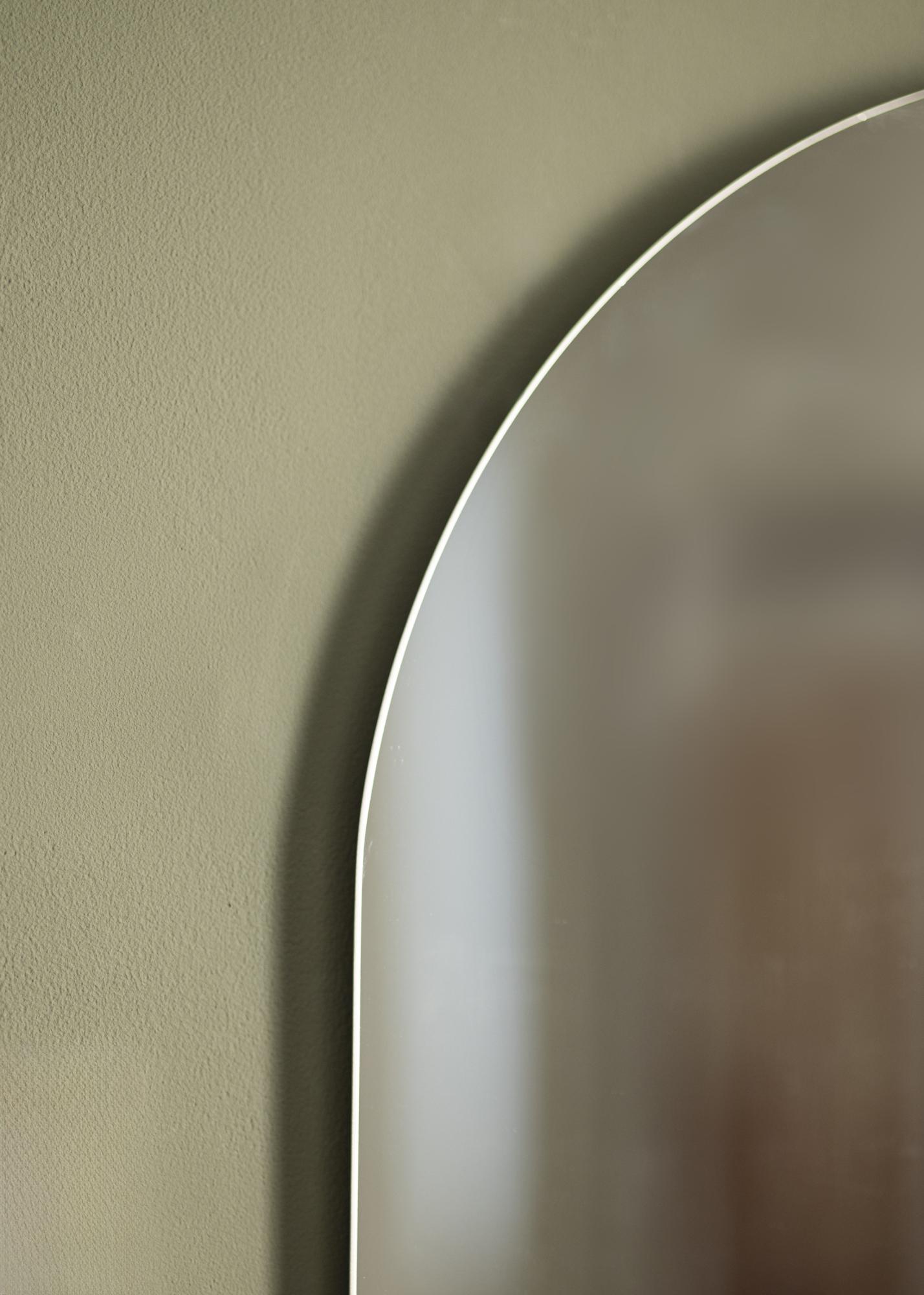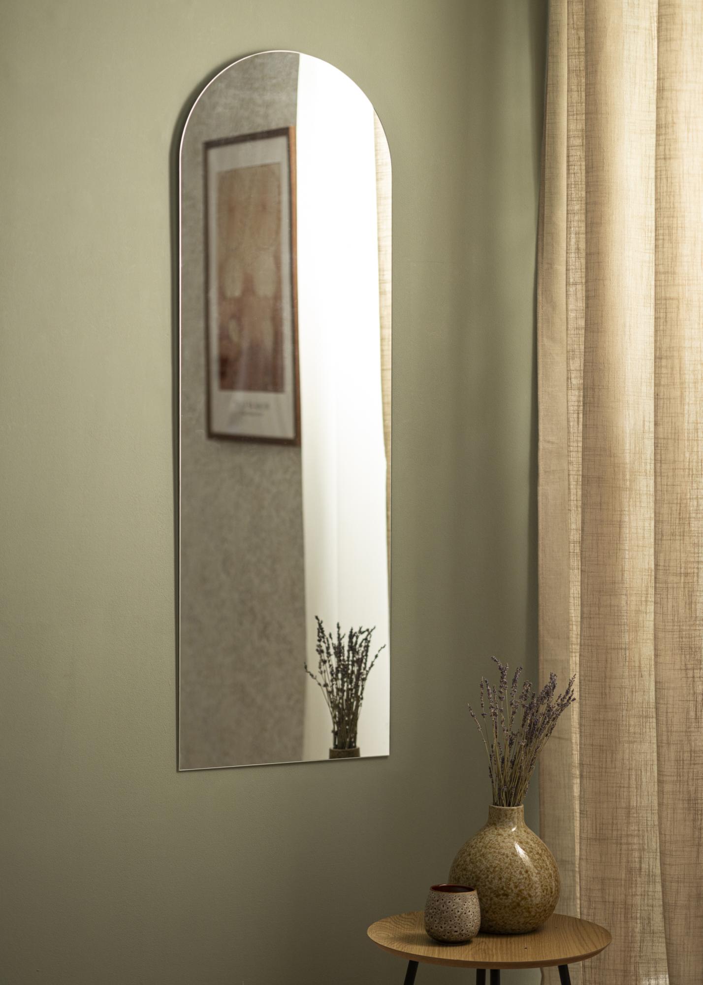 See on piklik seinapeegel, mis sobib hästi täispikkuses peeglina koridori või magamistuppa. See on ka väga stiilne, kui asetada see mööbli kohale – näiteks abilaud või puhvetkapp – dünaamilise kontrasti loomiseks. Seinapeeglil on minimalistlik disain koos kaarjate kujutega ilma peegliraamita. Peegliklaas on õhuke, lisaks elegantsusele.